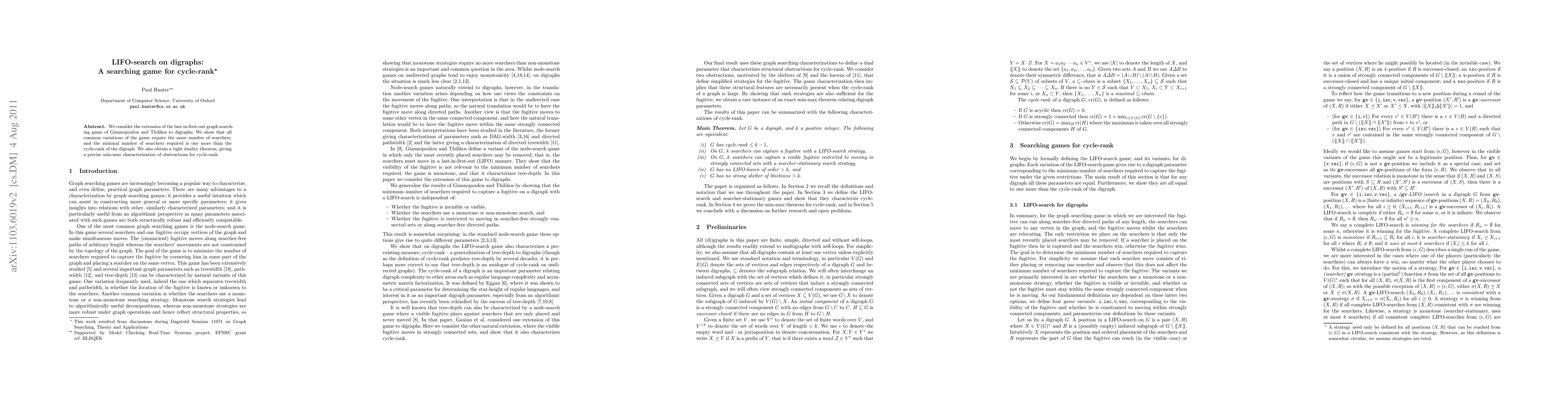 The paper explores a graph searching game on digraphs, finding that a minimal number of searchers equal the cycle-rank plus one, with a tight duality theorem providing insight into obstructions.