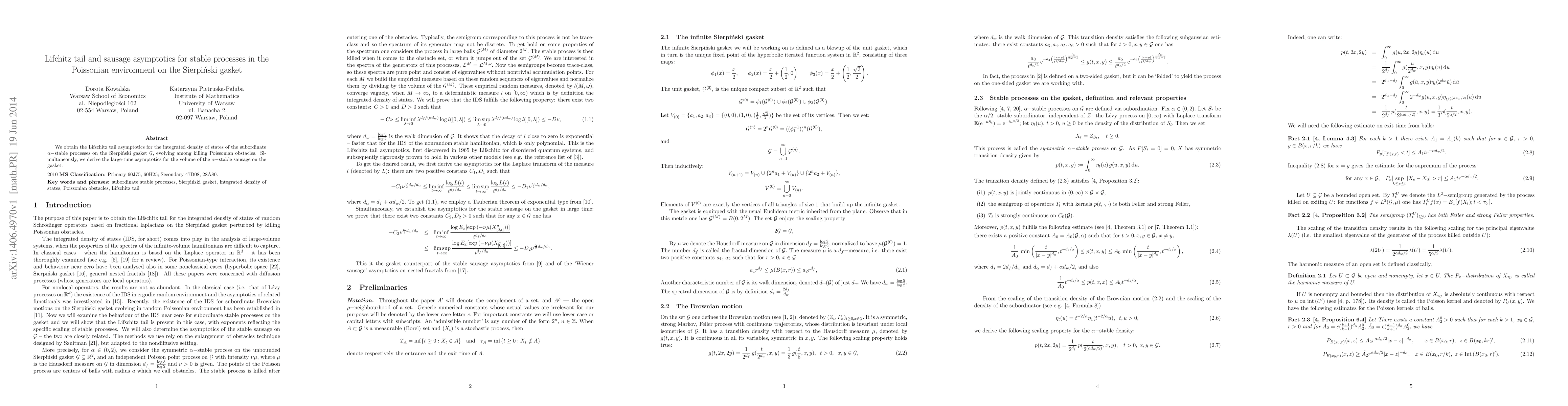 We obtain the Lifschitz tail asymptotics for the integrated density of states of the subordinate $\alpha-$stable processes on the Sierpi\'nski gasket $\mathcal G,$ evolving among killing Poissonian obstacles. Simultaneously, we derive the large-time asymptotics for the volume of the $\alpha-$stable sausage on the gasket.