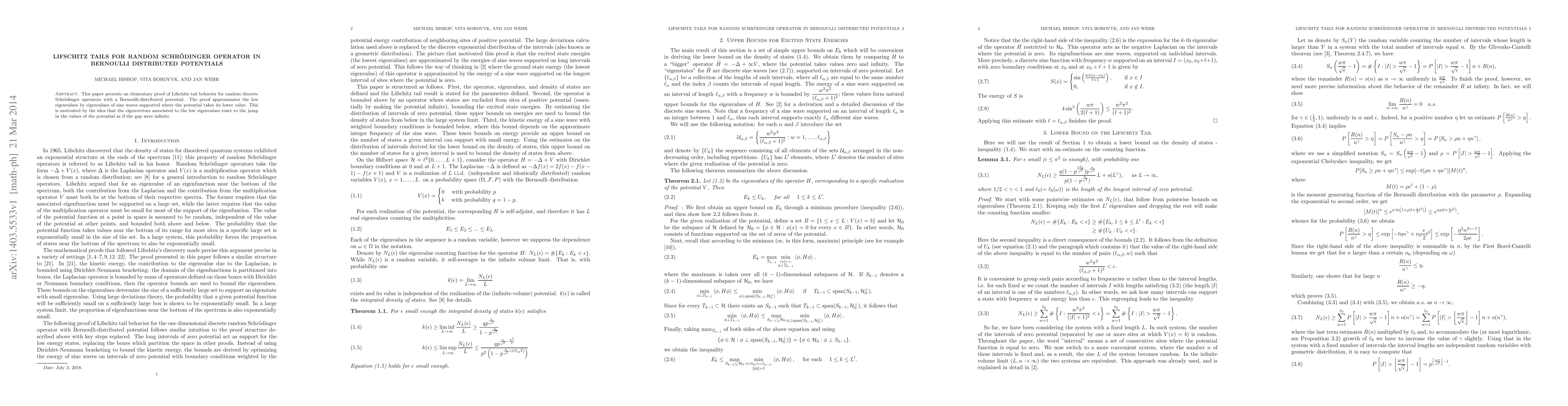 This paper presents an elementary proof of Lifschitz tail behavior for random discrete Schr\"{o}dinger operators with a Bernoulli-distributed potential. The proof approximates the low eigenvalues by eigenvalues of sine waves supported where the potential takes its lower value. This is motivated by the idea that the eigenvectors associated to the low eigenvalues react to the jump in the values of the potential as if the gap were infinite.