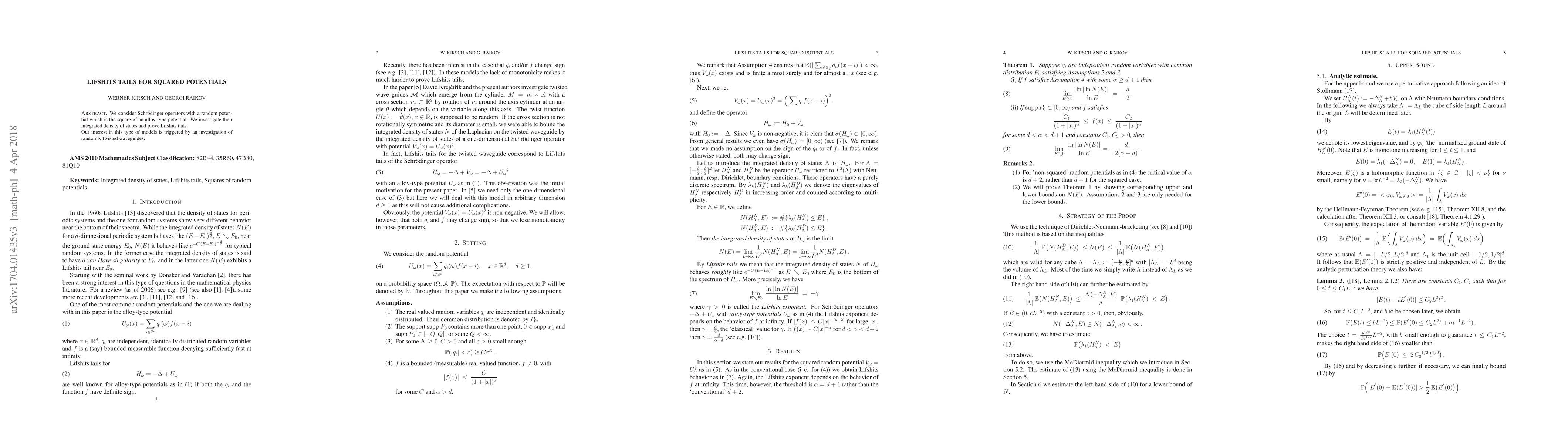 We consider Schr\"odinger operators with a random potential which is the square of an alloy-type potential. We investigate their integrated density of states and prove Lifshits tails. Our interest in this type of models is triggered by an investigation of randomly twisted waveguides.