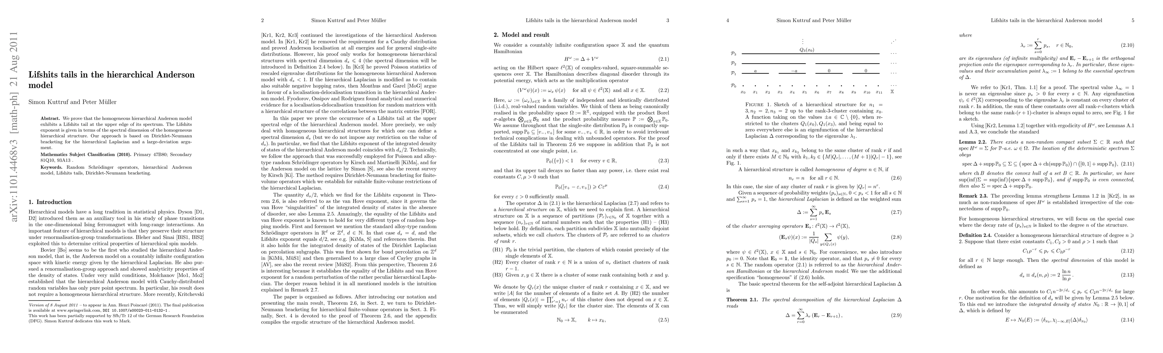The paper demonstrates that the hierarchical Anderson model displays a Lifshits tail at its spectral upper edge, with the tail's exponent linked to the model's spectral dimension. The analysis employs Dirichlet-Neumann bracketing for the hierarchical Laplacian and large-deviation principles.