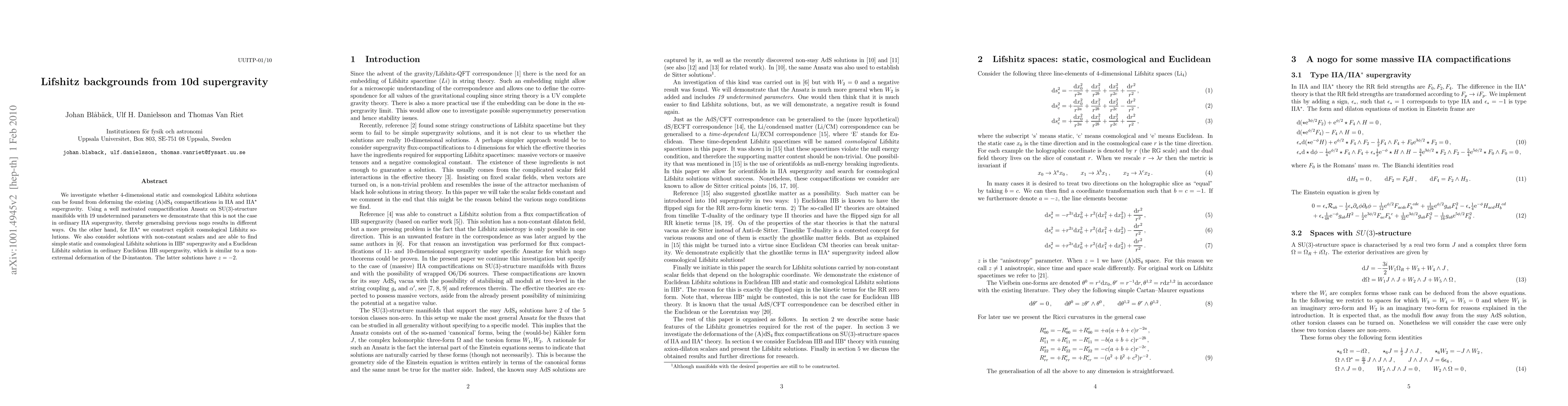 This paper explores the possibility of obtaining 4-dimensional Lifshitz solutions from 10-dimensional supergravity compactifications, finding no such solutions in IIA but constructing explicit cosmological Lifshitz solutions in IIA* and finding static and cosmological Lifshitz solutions in IIB* and a Euclidean Lifshitz solution in Euclidean IIB supergravity.
