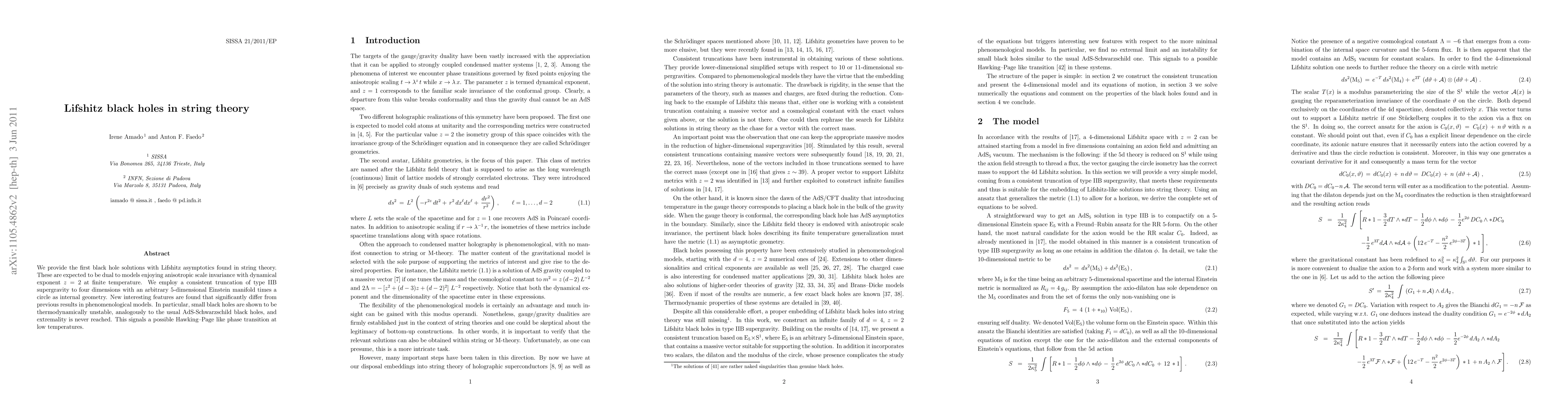 This paper presents the first string theory solutions for Lifshitz black holes, which exhibit anisotropic scale invariance with a dynamical exponent of z=2 at finite temperature. It reveals thermodynamic instability in small black holes and suggests a potential phase transition akin to Hawking-Page transition at low temperatures.