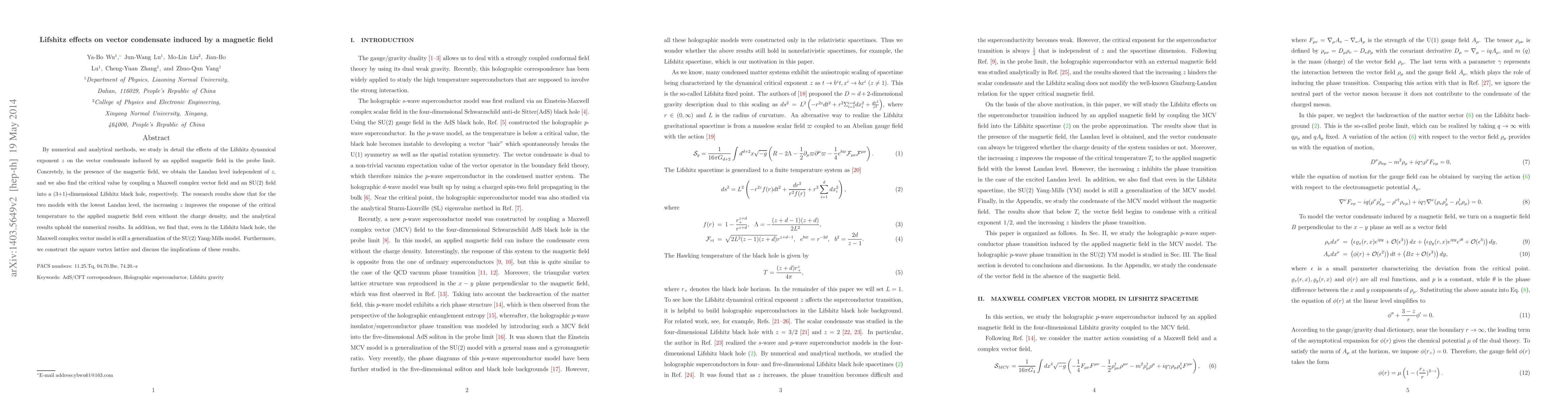 This paper investigates the influence of Lifshitz dynamical exponent $z$ on vector condensates under magnetic fields, revealing that increasing $z$ enhances the critical temperature response to magnetic fields. Analytical and numerical results confirm that the Maxwell complex vector model generalizes the SU(2) Yang-Mills model, even in Lifshitz black hole contexts.