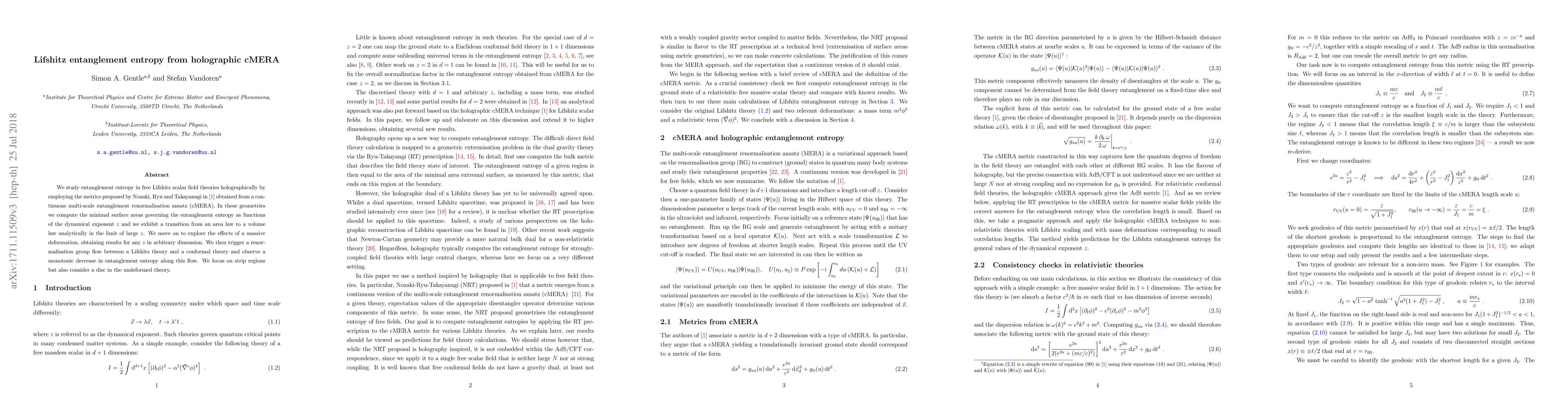 We study entanglement entropy in free Lifshitz scalar field theories holographically by employing the metrics proposed by Nozaki, Ryu and Takayanagi in \cite{Nozaki:2012zj} obtained from a continuous multi-scale entanglement renormalisation ansatz (cMERA). In these geometries we compute the minimal surface areas governing the entanglement entropy as functions of the dynamical exponent $z$ and we exhibit a transition from an area law to a volume law analytically in the limit of large $z$. We move on to explore the effects of a massive deformation, obtaining results for any $z$ in arbitrary dimension. We then trigger a renormalisation group flow between a Lifshitz theory and a conformal theory and observe a monotonic decrease in entanglement entropy along this flow. We focus on strip regions but also consider a disc in the undeformed theory.