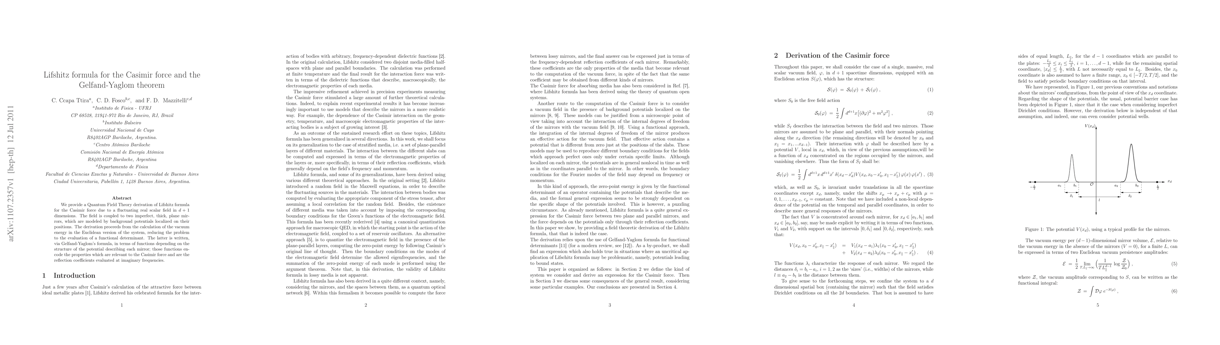 This paper derives the Lifshitz formula for the Casimir force using Quantum Field Theory, focusing on a fluctuating real scalar field in $d+1$ dimensions between two imperfect, thick plane mirrors. The vacuum energy calculation in Euclidean form leads to the evaluation of a functional determinant, expressed via Gelfand-Yaglom's formula in terms of reflection coefficients at imaginary frequencies.