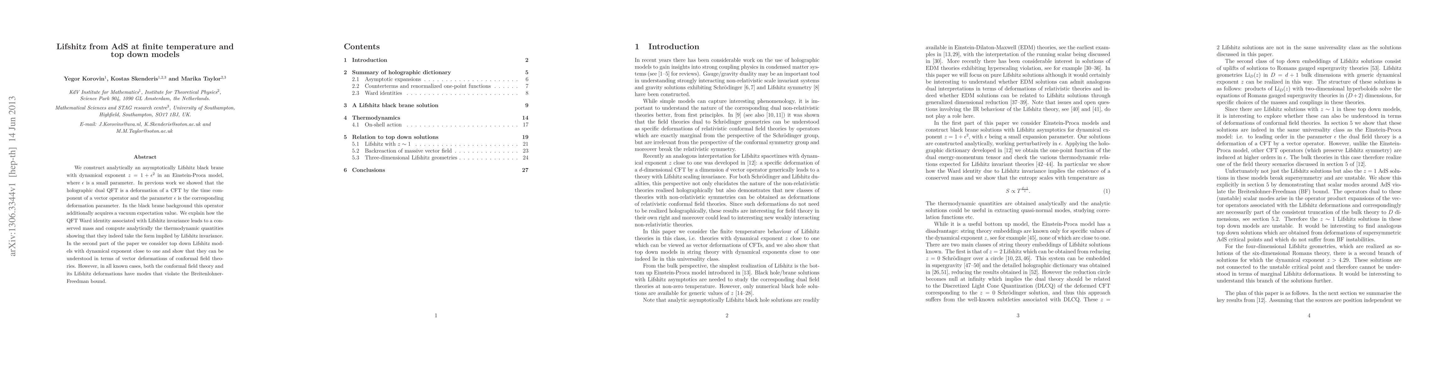 We construct analytically an asymptotically Lifshitz black brane with dynamical exponent z=1+epsilon^2 in an Einstein-Proca model, where epsilon is a small parameter. In previous work we showed that the holographic dual QFT is a deformation of a CFT by the time component of a vector operator and the parameter epsilon is the corresponding deformation parameter. In the black brane background this operator additionally acquires a vacuum expectation value. We explain how the QFT Ward identity associated with Lifshitz invariance leads to a conserved mass and compute analytically the thermodynamic quantities showing that they indeed take the form implied by Lifshitz invariance. In the second part of the paper we consider top down Lifshitz models with dynamical exponent close to one and show that they can be understood in terms of vector deformations of conformal field theories. However, in all known cases, both the conformal field theory and its Lifshitz deformations have modes that violate the Breitenlohner-Freedman bound.