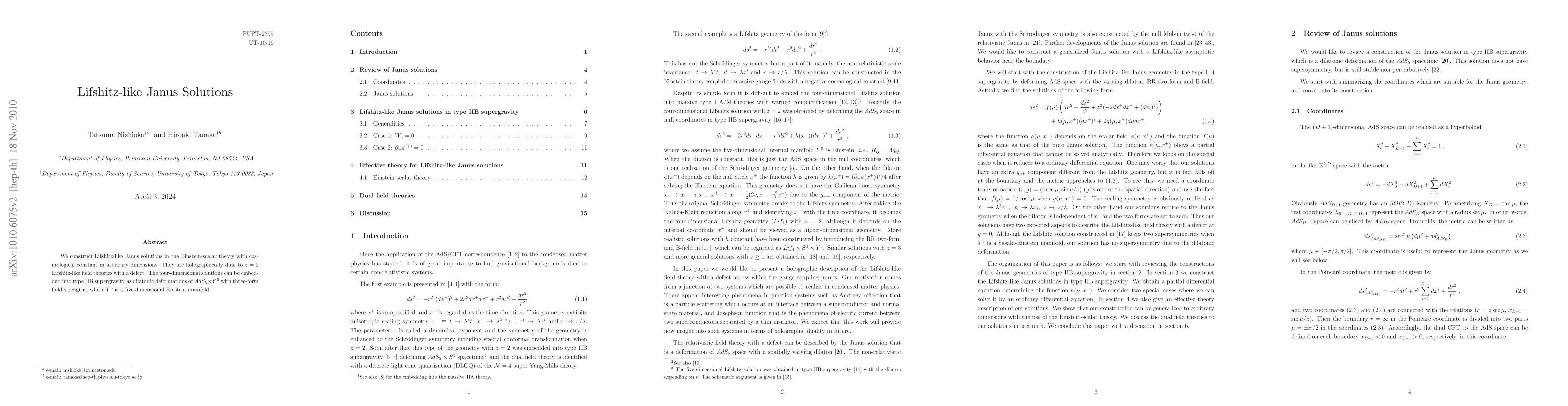 We construct Lifshitz-like Janus solutions in the Einstein-scalar theory with cosmological constant in arbitrary dimensions. They are holographically dual to z=2 Lifshitz-like field theories with a defect. The four-dimensional solutions can be embedded into type IIB supergravity as dilatonic deformations of AdS_5 x Y^5 with three-form field strengths, where Y^5 is a five-dimensional Einstein manifold.