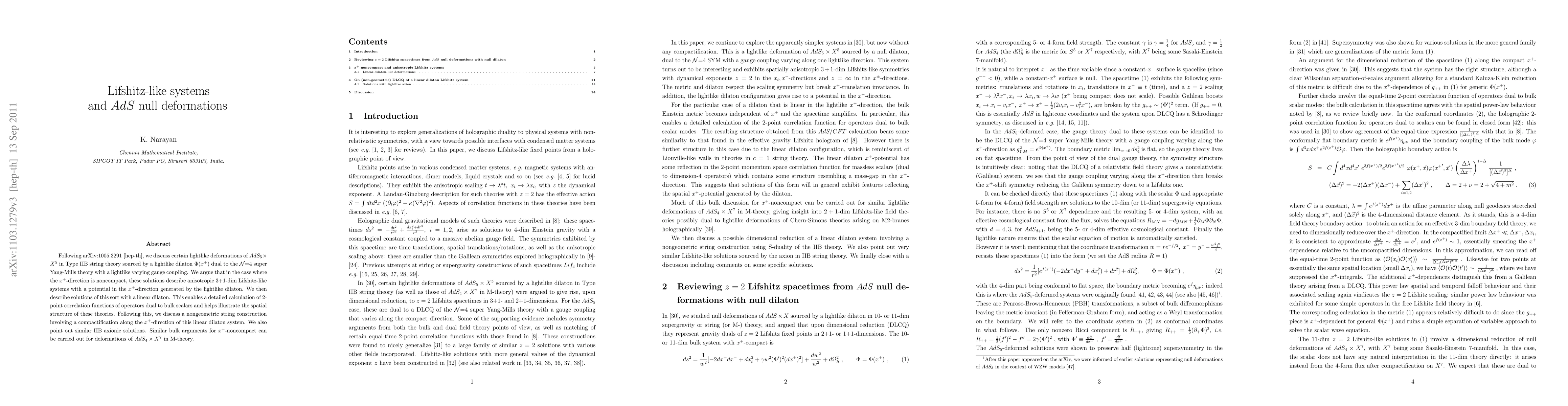 Following arXiv:1005.3291 [hep-th], we discuss certain lightlike deformations of $AdS_5\times X^5$ in Type IIB string theory sourced by a lightlike dilaton $\Phi(x^+)$ dual to the N=4 super Yang-Mills theory with a lightlike varying gauge coupling. We argue that in the case where the $x^+$-direction is noncompact, these solutions describe anisotropic 3+1-dim Lifshitz-like systems with a potential in the $x^+$-direction generated by the lightlike dilaton. We then describe solutions of this sort with a linear dilaton. This enables a detailed calculation of 2-point correlation functions of operators dual to bulk scalars and helps illustrate the spatial structure of these theories. Following this, we discuss a nongeometric string construction involving a compactification along the $x^+$-direction of this linear dilaton system. We also point out similar IIB axionic solutions. Similar bulk arguments for $x^+$-noncompact can be carried out for deformations of $AdS_4\times X^7$ in M-theory.