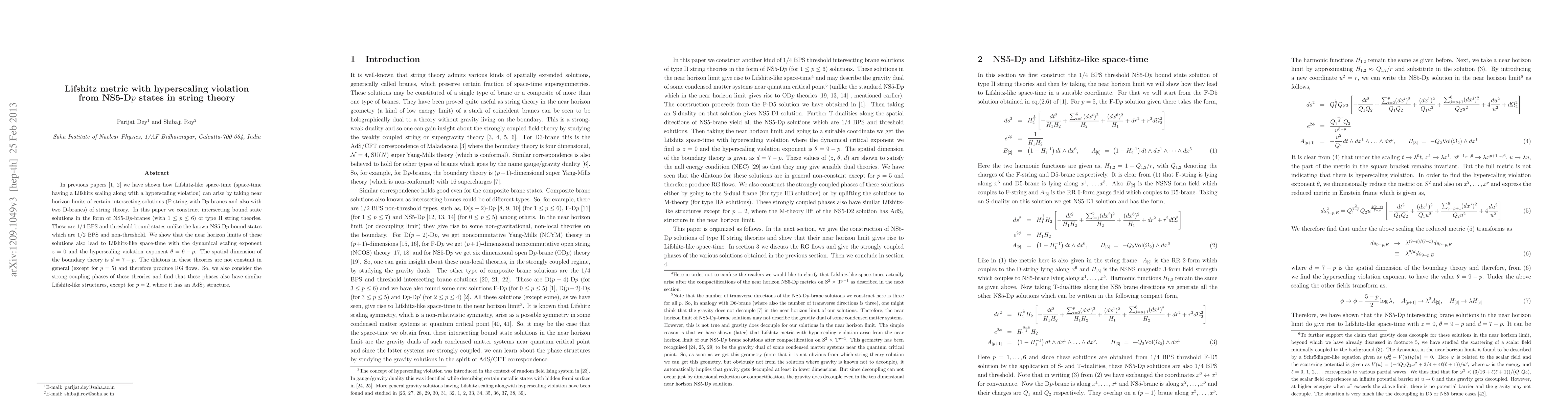 In our previous papers we have shown how Lifshitz-like space-time (space-time having a Lifshitz scaling along with a hyperscaling violation) can arise by taking near horizon limits of certain intersecting solutions (F-string with D$p$-branes and also with two D-branes) of string theory. In this paper we construct intersecting bound state solutions in the form of NS5-D$p$-branes (with $1\leq p \leq 6$) of type II string theories. These are 1/4 BPS and threshold bound states unlike the known NS5-D$p$ bound states which are 1/2 BPS and non-threshold. We show that the near horizon limits of these solutions also lead to Lifshitz-like space-time with the dynamical scaling exponent $z=0$ and the hyperscaling violation exponent $\theta=9-p$. The spatial dimension of the boundary theory is $d=7-p$. The dilatons in these theories are not constant in general (except for $p=5$) and therefore produce RG flows. So, we also consider the strong coupling phases of these theories and find that these phases also have similar Lifshitz-like structures, except for $p=2$, where it has an AdS$_3$ structure.