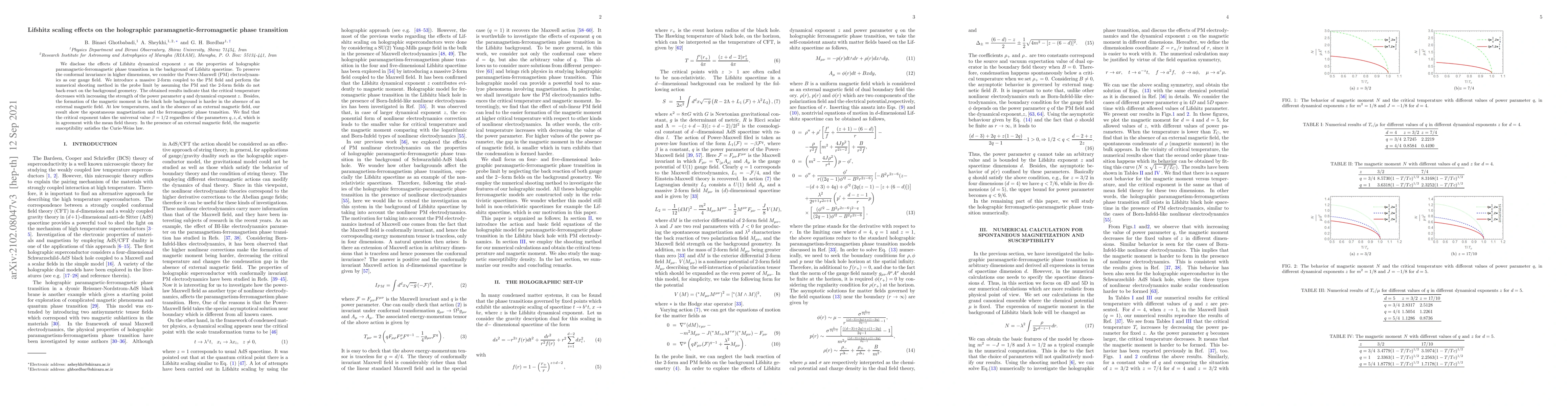 We disclose the effects of Lifshitz dynamical exponent $z$ on the properties of holographic paramagnetic-ferromagnetic phase transition in the background of Lifshitz spacetime. To preserve the conformal invariance in higher dimensions, we consider the Power-Maxwell (PM) electrodynamics as our gauge field. We introduce a massive $2$-form coupled to the PM field and perform the numerical shooting method in the probe limit by assuming the PM and the $2$-form fields do not back-react on the background geometry. The obtained results indicate that the critical temperature decreases with increasing the strength of the power parameter $q$ and dynamical exponent $z$. Besides, the formation of the magnetic moment in the black hole background is harder in the absence of an external magnetic field. At low temperatures, and in the absence of an external magnetic field, our result show the spontaneous magnetization and the ferromagnetic phase transition. We find that the critical exponent takes the universal value $\beta= 1/2$ regardless of the parameters $q, z, d$, which is in agreement with the mean field theory. In the presence of an external magnetic field, the magnetic susceptibility satisfies the Curie-Weiss law.