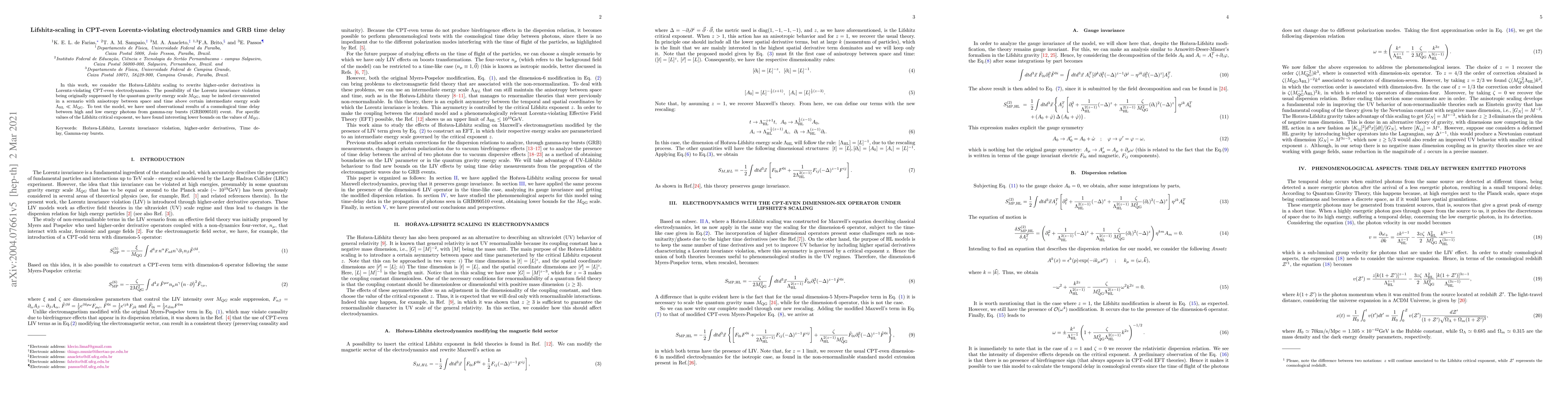 This paper explores Lifshitz scaling in Lorentz-violating electrodynamics, proposing that anisotropy between space and time at an intermediate energy scale can circumvent quantum gravity suppression. It tests this model using time delay observations from a gamma-ray burst, deriving lower bounds on the quantum gravity energy scale.