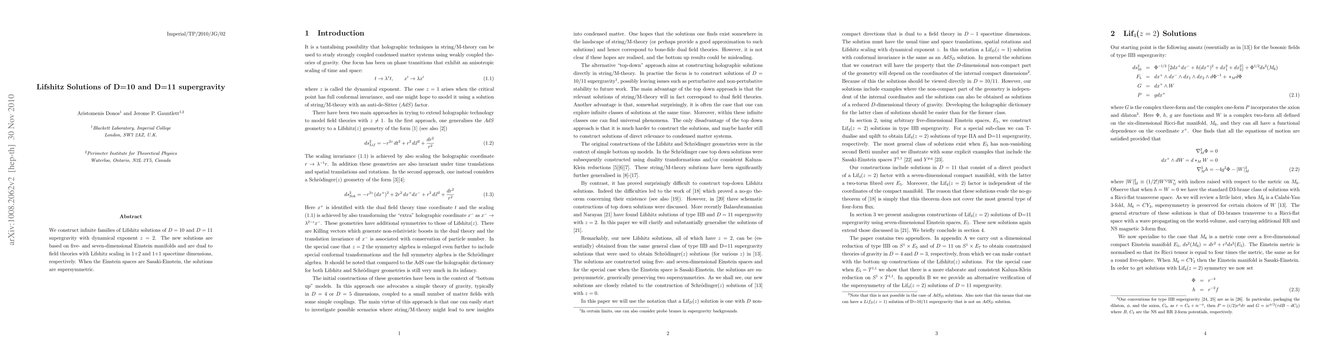 This paper constructs new Lifshitz solutions of D=10 and D=11 supergravity with a dynamical exponent z=2, based on five- and seven-dimensional Einstein manifolds, which are dual to theories in lower dimensions and are supersymmetric when the Einstein spaces are Sasaki-Einstein.