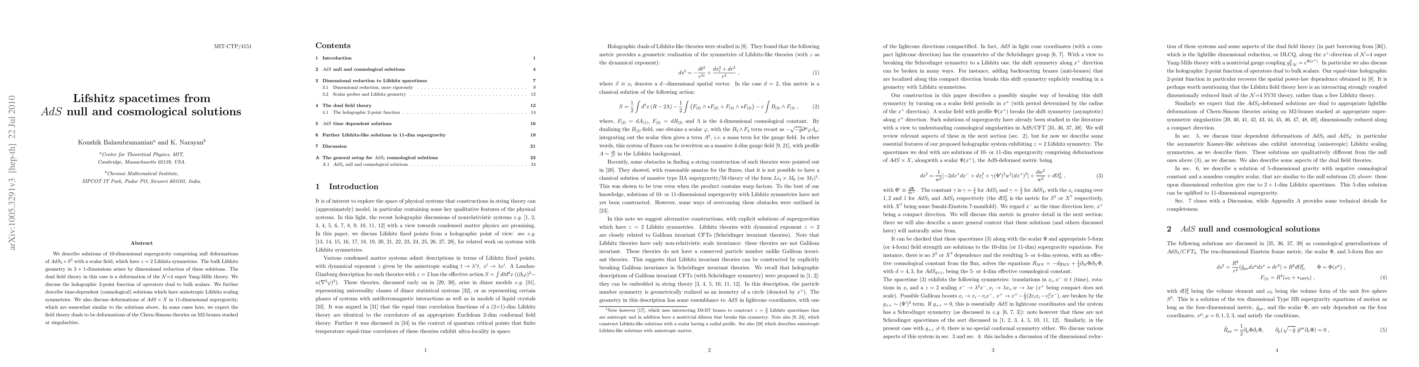We describe solutions of 10-dimensional supergravity comprising null deformations of $AdS_5\times S^5$ with a scalar field, which have $z=2$ Lifshitz symmetries. The bulk Lifshitz geometry in 3+1-dimensions arises by dimensional reduction of these solutions. The dual field theory in this case is a deformation of the N=4 super Yang-Mills theory. We discuss the holographic 2-point function of operators dual to bulk scalars. We further describe time-dependent (cosmological) solutions which have anisotropic Lifshitz scaling symmetries. We also discuss deformations of $AdS\times X$ in 11-dimensional supergravity, which are somewhat similar to the solutions above. In some cases here, we expect the field theory duals to be deformations of the Chern-Simons theories on M2-branes stacked at singularities.
