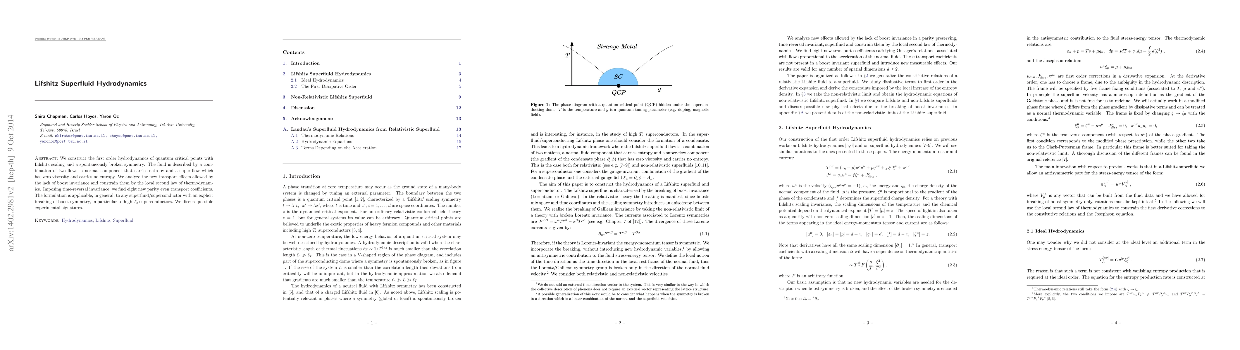 The research constructs the first-order hydrodynamics of quantum critical points with Lifshitz scaling and a spontaneously broken symmetry, combining normal and superfluid flows.