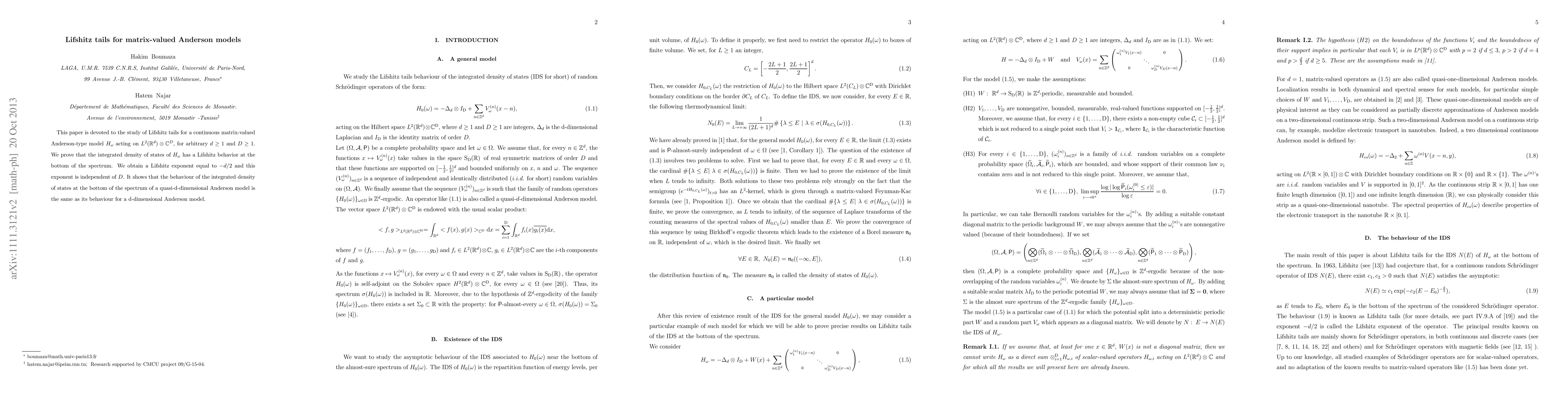This paper studies Lifshitz tails for a matrix-valued Anderson model, finding that the integrated density of states at the bottom of the spectrum has a Lifshitz behavior with an exponent of $-d/2$, independent of $D$.