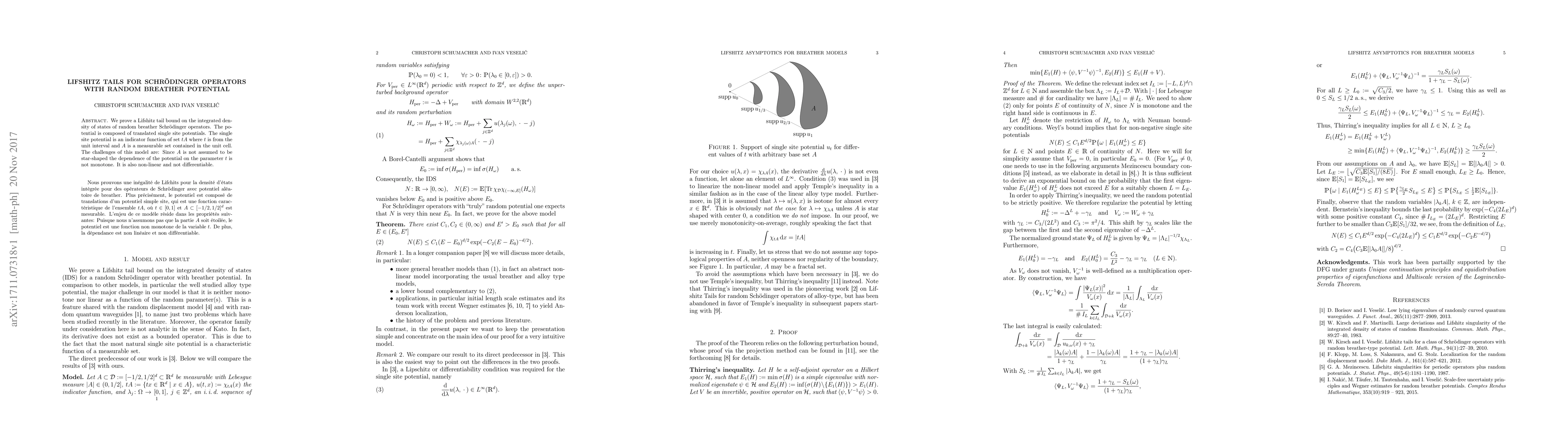 Summary: This paper establishes a Lifshitz tail bound for the integrated density of states in random breather Schrödinger operators, where the potential consists of translated single site potentials. The complexity arises from the non-monotonic, non-linear, and non-differentiable nature of the potential due to the non-star-shaped set $A$.