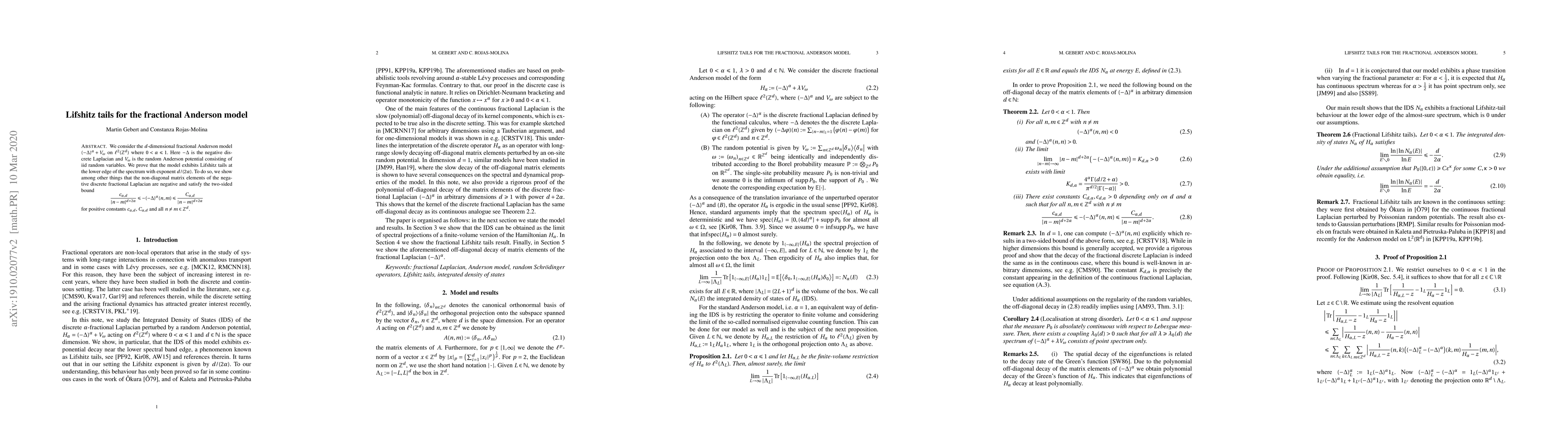 The fractional Anderson model exhibits Lifshitz tails with an exponent of d/(2*alpha) at its lower edge of the spectrum. This finding is established through bounds on the negative discrete fractional Laplacian's matrix elements.