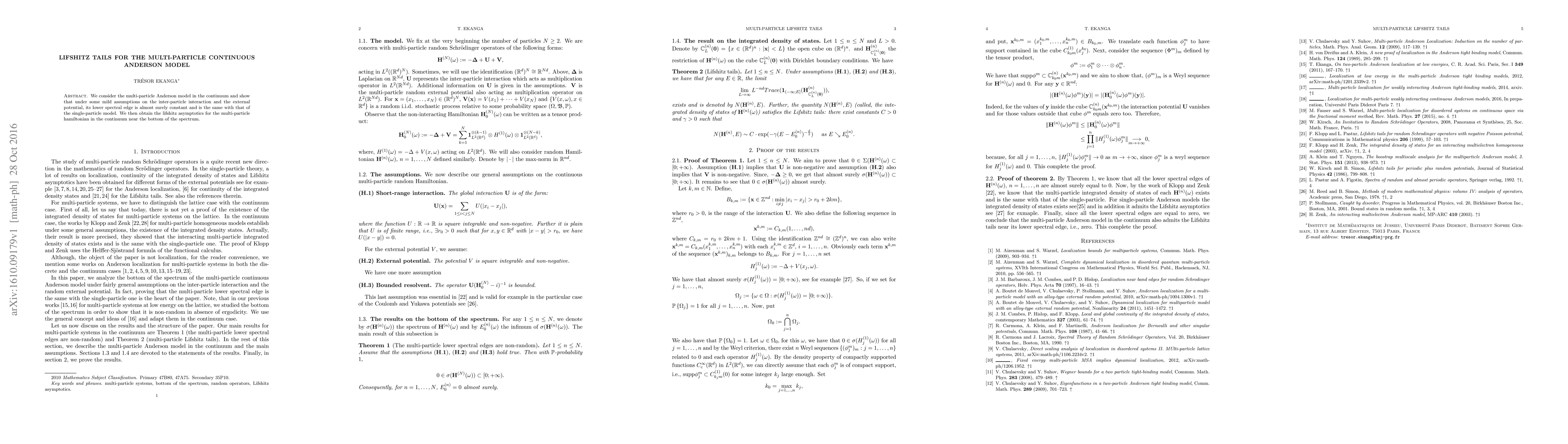 We consider the multi-particle Anderson model in the continuum and show that under some mild assumptions on the inter-particle interaction and the external potential, its lower spectral edge is almost surely constant and is the same with that of the single-particle model. We then obtain the lifshitz asymptotics for the multi-particle hamiltonian in the continuum near the bottom of the spectrum.
