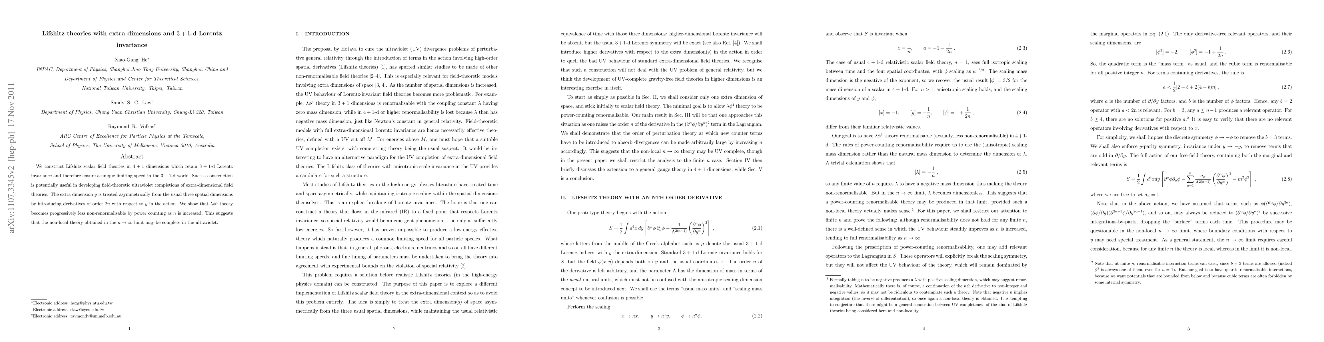 We construct Lifshitz scalar field theories in 4+1 dimensions which retain 3+1-d Lorentz invariance and therefore ensure a unique limiting speed in the 3+1-d world. Such a construction is potentially useful in developing field-theoretic ultraviolet completions of extra-dimensional field theories. The extra dimension y is treated asymmetrically from the usual three spatial dimensions by introducing derivatives of order 2n with respect to y in the action. We show that lambda phi^4 theory becomes progressively less non-renormalisable by power counting as n is increased. This suggests that the non-local theory obtained in the infinite-n limit may be complete in the ultraviolet.