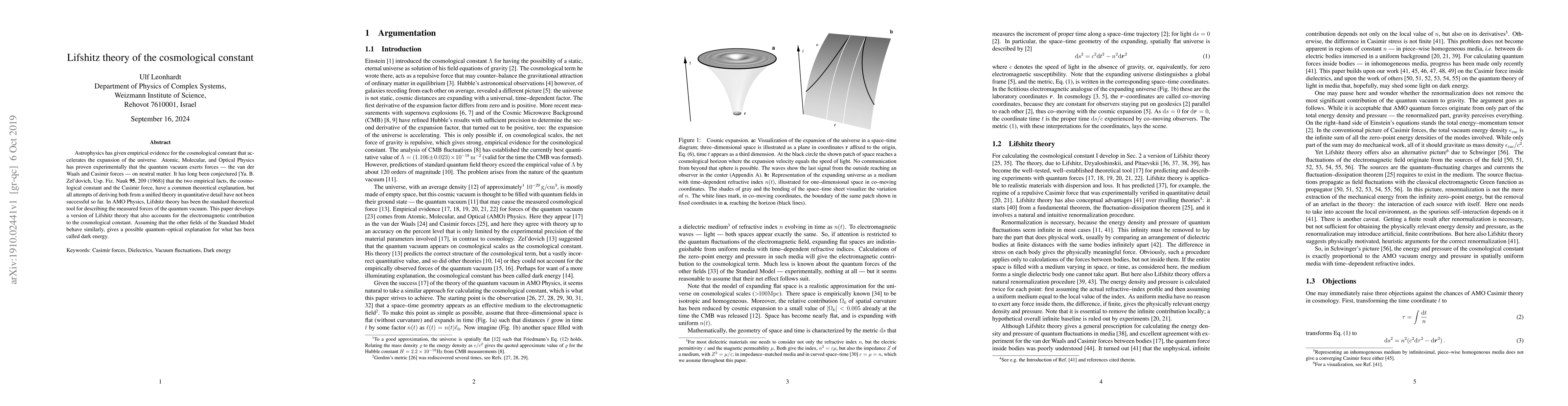 Astrophysics has given empirical evidence for the cosmological constant that accelerates the expansion of the universe. Atomic, Molecular, and Optical Physics has proven experimentally that the quantum vacuum exerts forces - the van der Waals and Casimir forces - on neutral matter. It has long been conjectured [Ya. B. Zel'dovich, Usp. Fiz. Nauk 95, 209 (1968)] that the two empirical facts, the cosmological constant and the Casimir force, have a common theoretical explanation, but all attempts of deriving both from a unified theory in quantitative detail have not been successful so far. In AMO Physics, Lifshitz theory has been the standard theoretical tool for describing the measured forces of the quantum vacuum. This paper develops a version of Lifshitz theory that also accounts for the electromagnetic contribution to the cosmological constant. Assuming that the other fields of the Standard Model behave similarly, gives a possible quantum-optical explanation for what has been called dark energy.