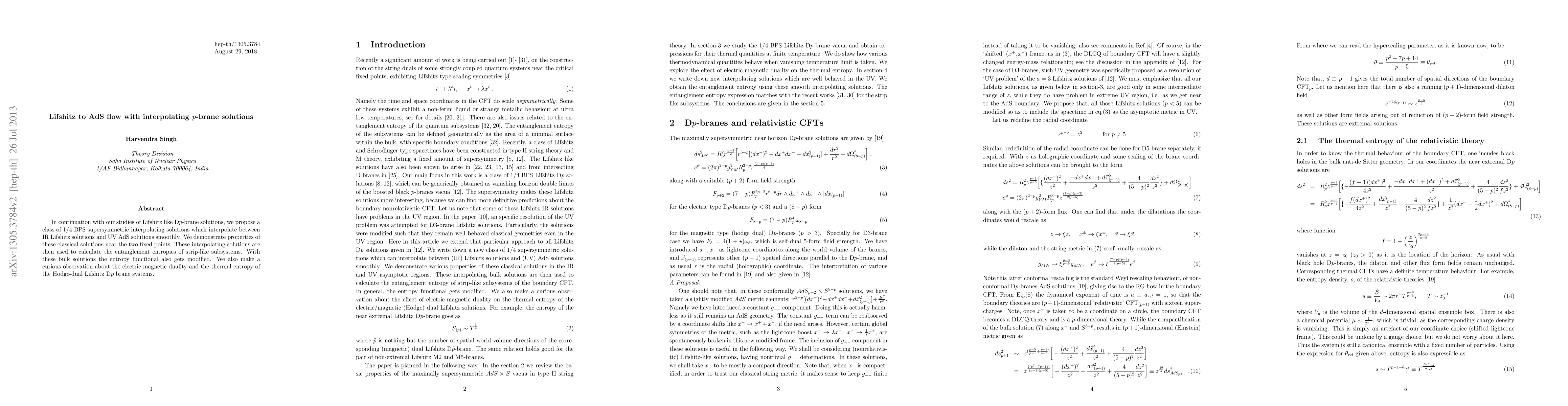 In continuation with our studies of Lifshitz like D$p$-brane solutions, we propose a class of 1/4 BPS supersymmetric interpolating solutions which interpolate between IR Lifshitz solutions and UV AdS solutions smoothly. We demonstrate properties of these classical solutions near the two fixed points. These interpolating solutions are then used to calculate the entanglement entropies of strip-like subsystems. With these bulk solutions the entropy functional also gets modified. We also make a curious observation about the electric-magnetic duality and the thermal entropy of the Hodge-dual Lifshitz D$p$ brane systems.
