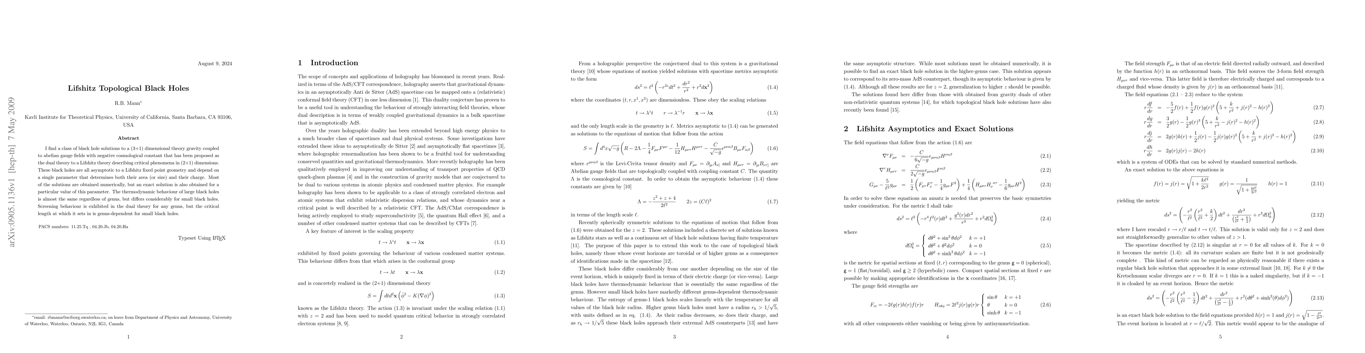 I find a class of black hole solutions to a (3+1) dimensional theory gravity coupled to abelian gauge fields with negative cosmological constant that has been proposed as the dual theory to a Lifshitz theory describing critical phenomena in (2+1) dimensions. These black holes are all asymptotic to a Lifshitz fixed point geometry and depend on a single parameter that determines both their area (or size) and their charge. Most of the solutions are obtained numerically, but an exact solution is also obtained for a particular value of this parameter. The thermodynamic behaviour of large black holes is almost the same regardless of genus, but differs considerably for small black holes. Screening behaviour is exhibited in the dual theory for any genus, but the critical length at which it sets in is genus-dependent for small black holes.