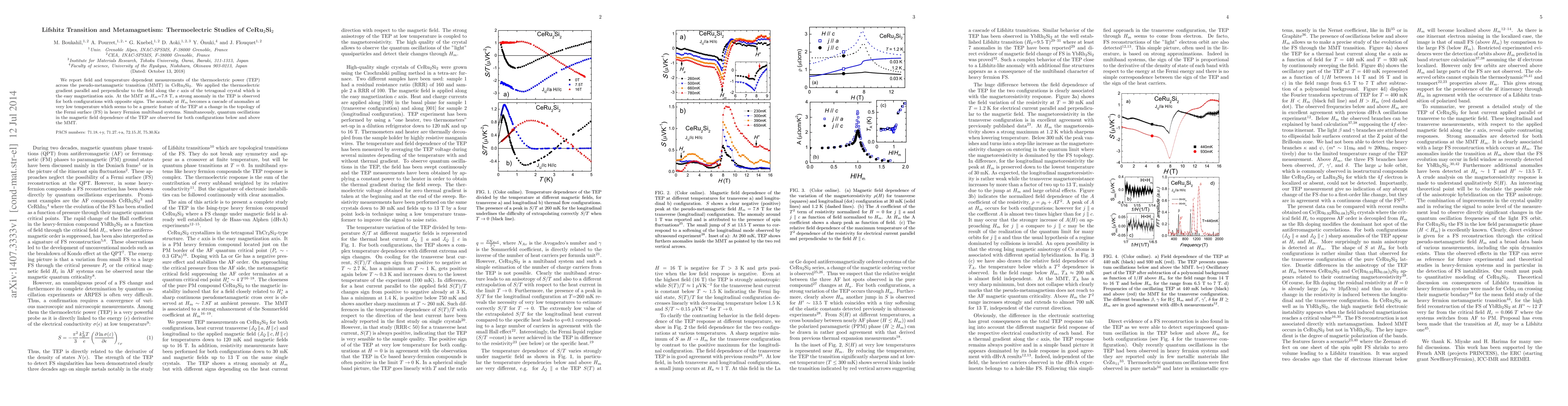 We report field and temperature dependent measurements of the thermoelectric power (TEP) across the pseudo-metamagnetic transition (MMT) in CeRu$_2$Si$_2$. We applied the thermoelectric gradient parallel and perpendicular to the field along the c axis of the tetragonal crystal which is the easy magnetization axis. At the MMT at H$_m$=7.8 T, a strong anomaly in the TEP is observed for both configurations with opposite signs. The anomaly at Hm becomes a cascade of anomalies at very low temperature which seems to be a generic feature of the TEP at a change in the topology of the Fermi surface (FS) in heavy Fermion multiband systems. Simultaneously, quantum oscillations in the magnetic field dependence of the TEP are observed for both configurations below and above the MMT.