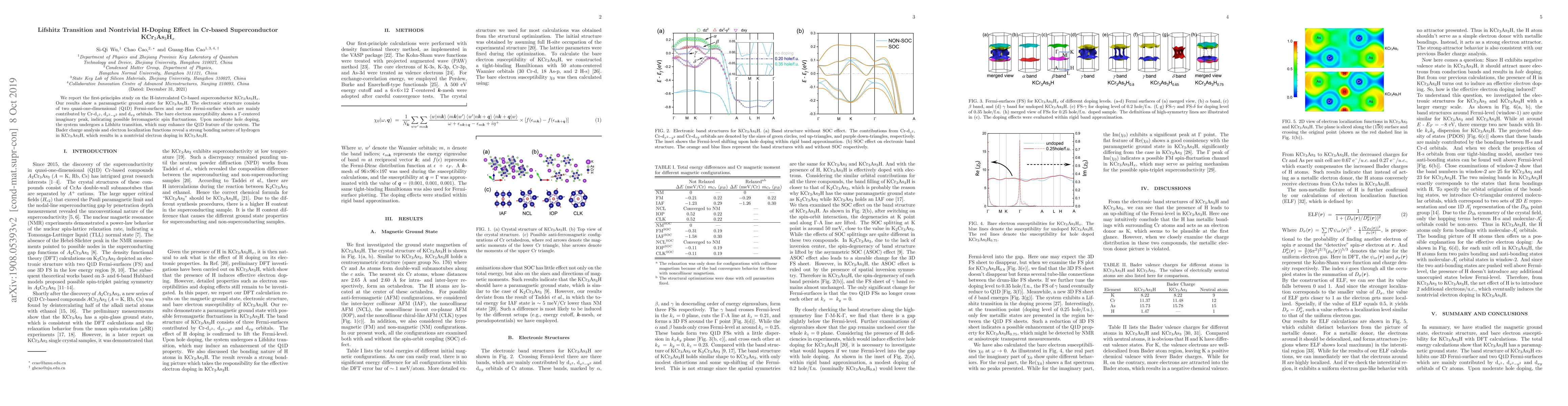 This study investigates the electronic structure of hydrogen-intercalated Cr-based superconductor KCr$_3$As$_3$H$_x$, revealing a paramagnetic ground state and a Lifshitz transition upon hole doping. The system exhibits quasi-one-dimensional Fermi surfaces and strong hydrogen bonding, suggesting a nontrivial doping effect.