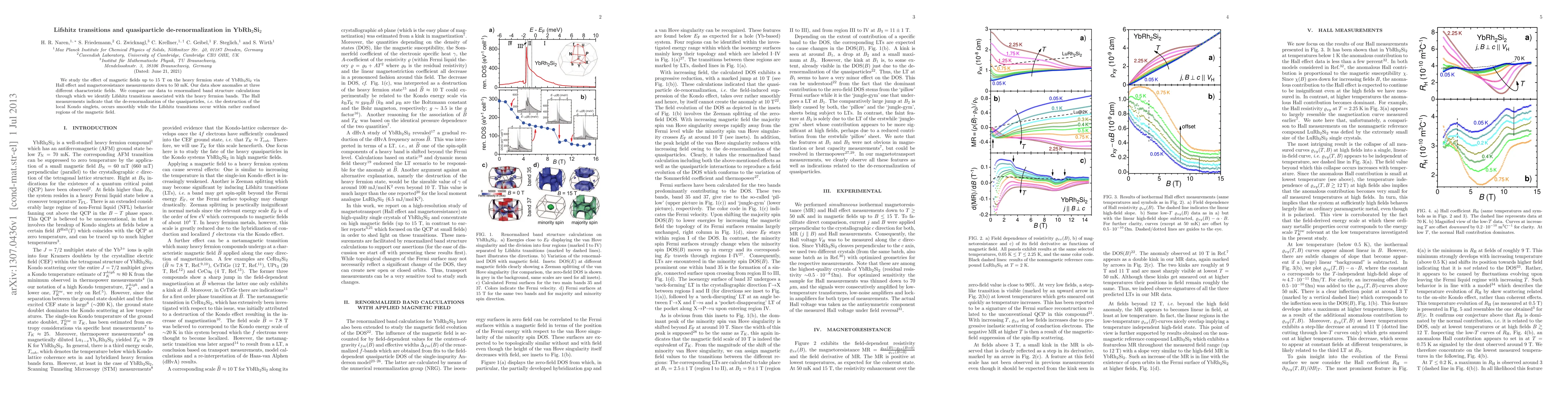 This study investigates the impact of magnetic fields on YbRh$_2$Si$_2$'s heavy fermion state, revealing anomalies at three fields via Hall effect and magnetoresistance measurements. The research identifies Lifshitz transitions linked to heavy fermion bands and finds that quasiparticle de-renormalization occurs smoothly, contrasting with the localized nature of Lifshitz transitions.