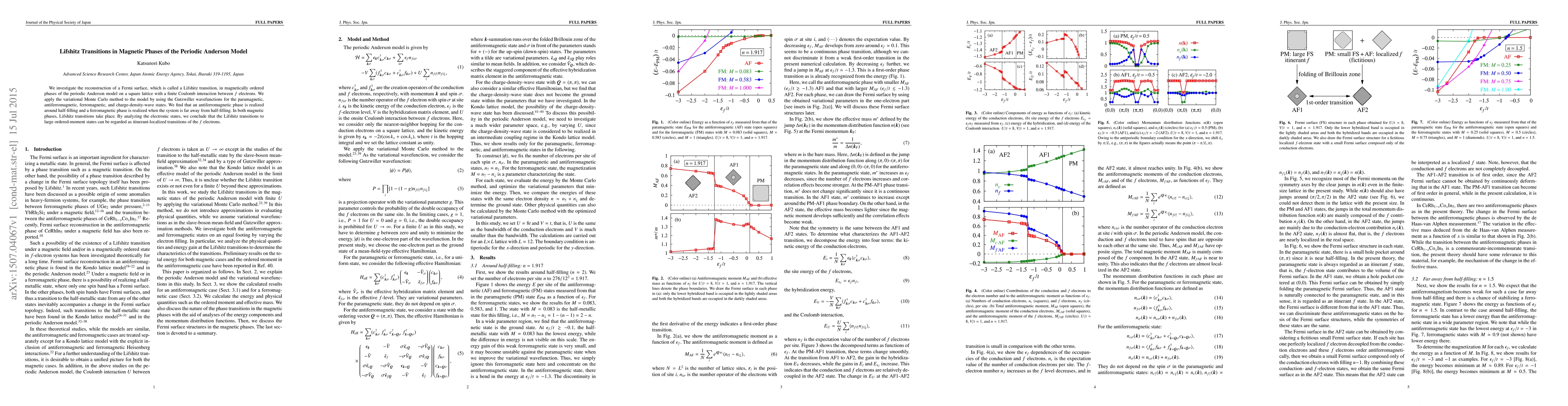 This study uses variational Monte Carlo to explore Lifshitz transitions in magnetic phases of the periodic Anderson model, revealing that antiferromagnetic and ferromagnetic phases induce these transitions, which are interpreted as itinerant-localized transitions of f electrons.