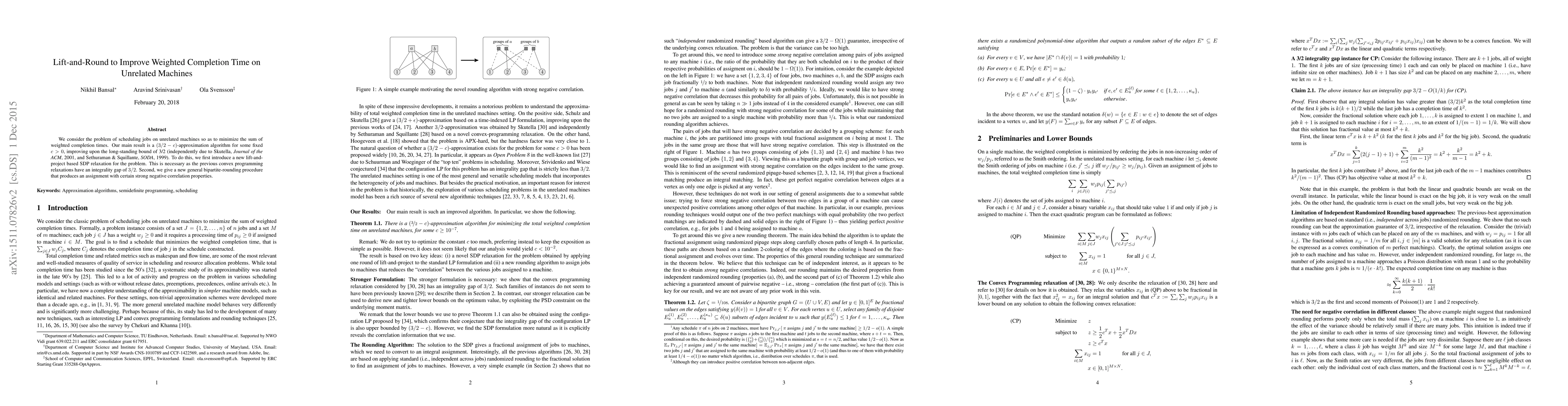 Researchers develop an approximation algorithm to minimize weighted completion times on unrelated machines, improving upon a long-standing bound of 3/2, with a new lift-and-project based SDP relaxation and bipartite-rounding procedure.