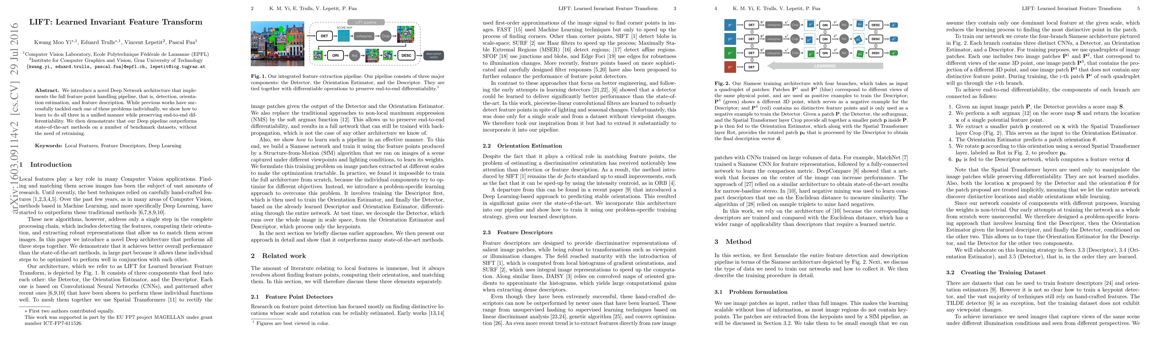 This research presents LIFT, a Deep Network architecture that integrates feature point detection, orientation estimation, and description into a single, differentiable pipeline. The method outperforms existing techniques on benchmark datasets without requiring retraining.