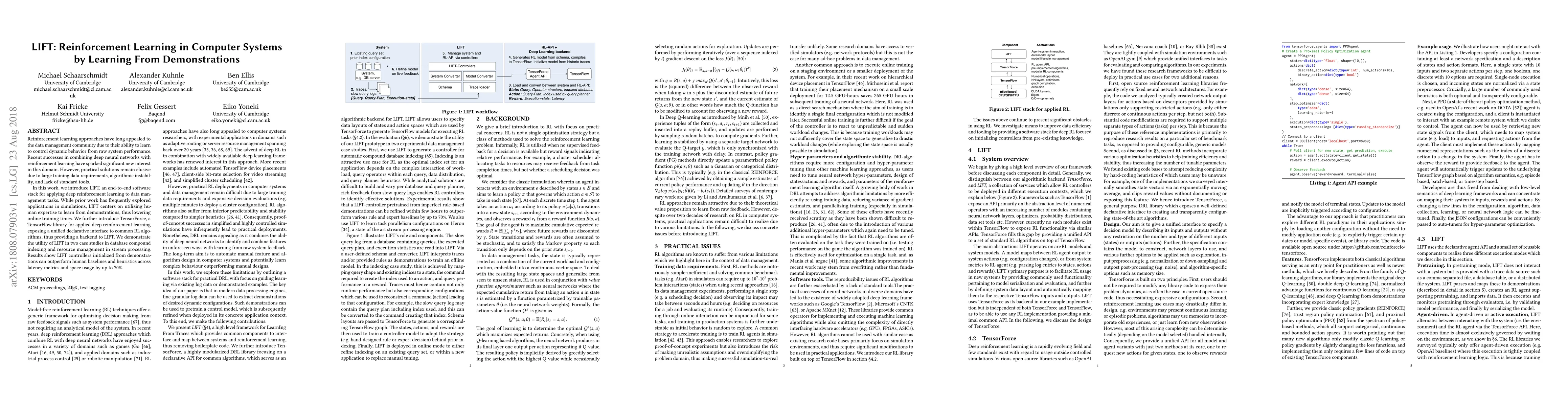 LIFT is a software stack for applying deep reinforcement learning to data management tasks, utilizing human expertise to learn from demonstrations and reducing training times. It leverages TensorForce, a TensorFlow library for RL, and demonstrates significant improvements over human baselines and heuristics in database indexing and stream processing resource management.