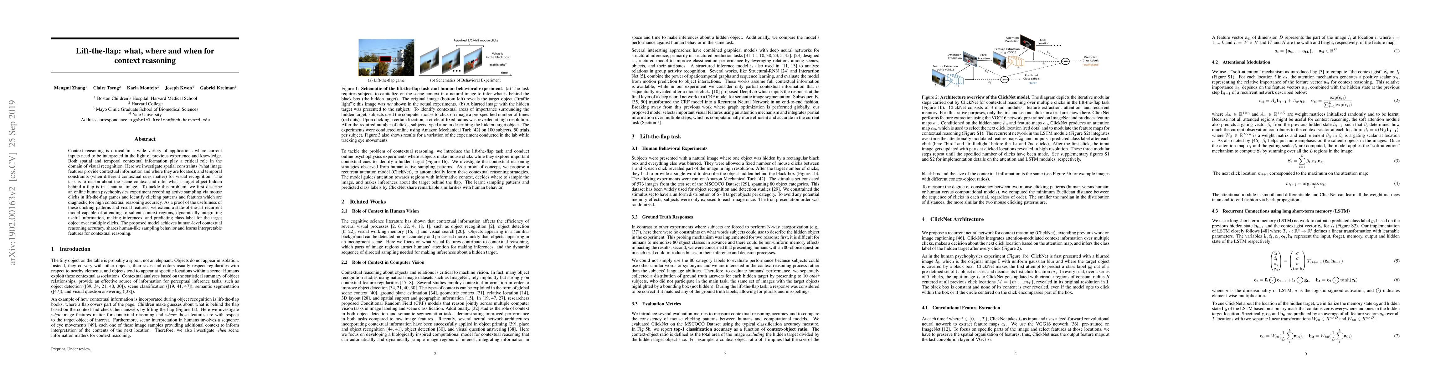 Context reasoning is critical in a wide variety of applications where current inputs need to be interpreted in the light of previous experience and knowledge. Both spatial and temporal contextual information play a critical role in the domain of visual recognition. Here we investigate spatial constraints (what image features provide contextual information and where they are located), and temporal constraints (when different contextual cues matter) for visual recognition. The task is to reason about the scene context and infer what a target object hidden behind a flap is in a natural image. To tackle this problem, we first describe an online human psychophysics experiment recording active sampling via mouse clicks in lift-the-flap games and identify clicking patterns and features which are diagnostic for high contextual reasoning accuracy. As a proof of the usefulness of these clicking patterns and visual features, we extend a state-of-the-art recurrent model capable of attending to salient context regions, dynamically integrating useful information, making inferences, and predicting class label for the target object over multiple clicks. The proposed model achieves human-level contextual reasoning accuracy, shares human-like sampling behavior and learns interpretable features for contextual reasoning.