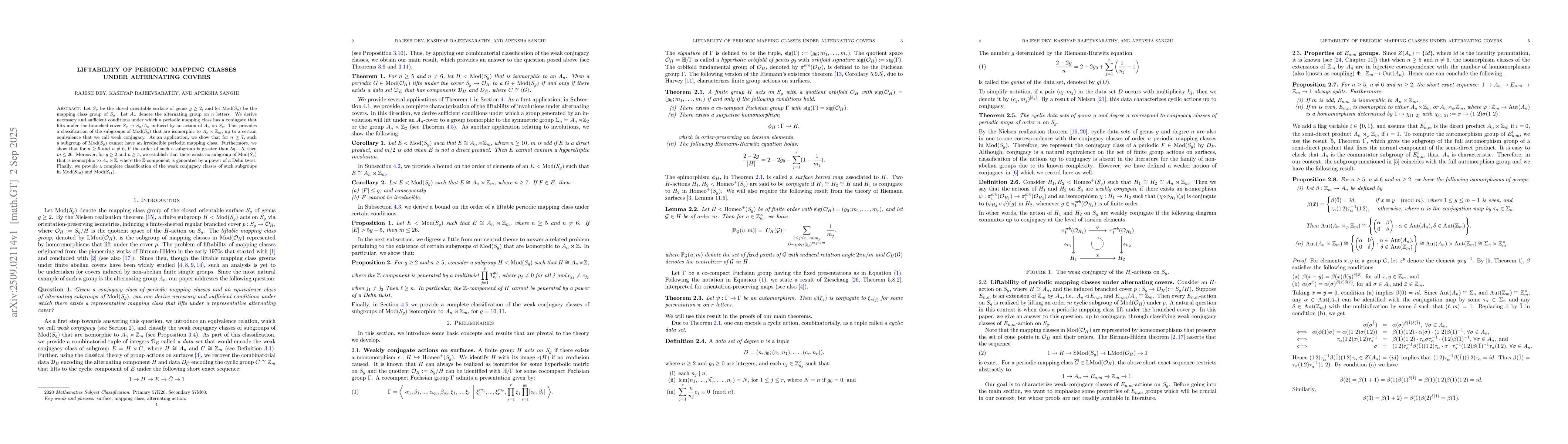 Let $S_g$ be the closed orientable surface of genus $g \geq 2$, and let $\mathrm{Mod}(S_g)$ be the mapping class group of $S_g$. Let $A_n$ denote the alternating group on $n$ letters. We derive necessary and sufficient conditions under which a periodic mapping class has a conjugate that lifts under the branched cover $S_g \to S_g/A_n$ induced by an action of $A_n$ on $S_g$. This provides a classification of the subgroups of $\mathrm{Mod}(S_g)$ that are isomorphic to $A_n \rtimes \mathbb{Z}_m$, up to a certain equivalence that we call weak conjugacy. As an application, we show that for $n \geq 7$, such a subgroup of $\mathrm{Mod}(S_g)$ cannot have an irreducible periodic mapping class. Furthermore, we show that for $n \geq 5$ and $n \neq 6$, if the order of such a subgroup is greater than $5g-5$, then $m \leq 26$. Moreover, for $g \geq 2$ and $n \geq 5$, we establish that there exists no subgroup of $\mathrm{Mod}(S_g)$ that is isomorphic to $A_n \rtimes \mathbb{Z}$, where the $\mathbb{Z}$-component is generated by a power of a Dehn twist. Finally, we provide a complete classification of the weak conjugacy classes of such subgroups in $\mathrm{Mod}(S_{10})$ and $\mathrm{Mod}(S_{11})$.