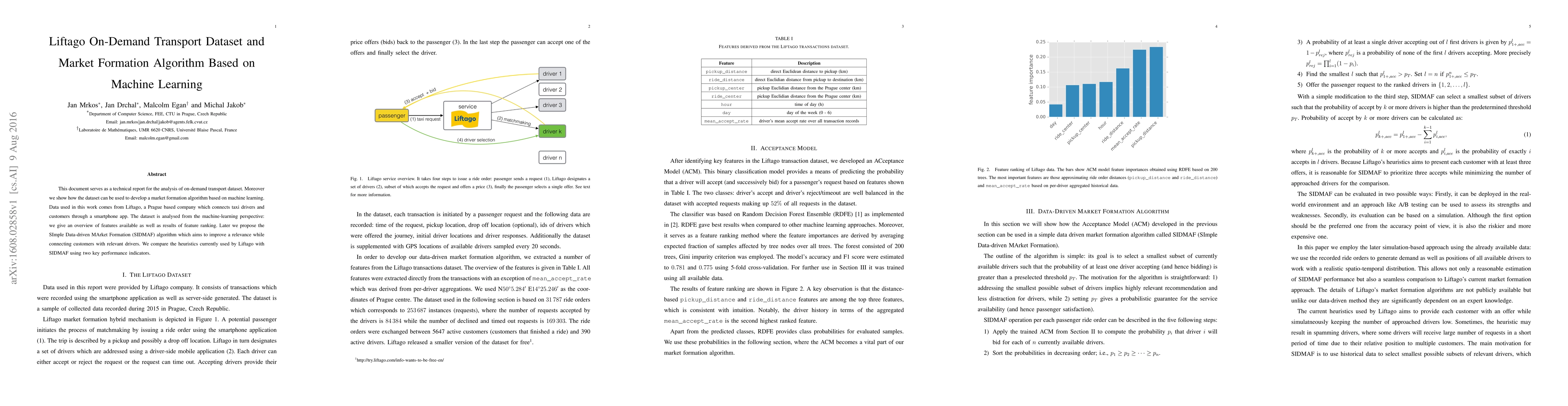 This document serves as a technical report for the analysis of on-demand transport dataset. Moreover we show how the dataset can be used to develop a market formation algorithm based on machine learning. Data used in this work comes from Liftago, a Prague based company which connects taxi drivers and customers through a smartphone app. The dataset is analysed from the machine-learning perspective: we give an overview of features available as well as results of feature ranking. Later we propose the SImple Data-driven MArket Formation (SIDMAF) algorithm which aims to improve a relevance while connecting customers with relevant drivers. We compare the heuristics currently used by Liftago with SIDMAF using two key performance indicators.