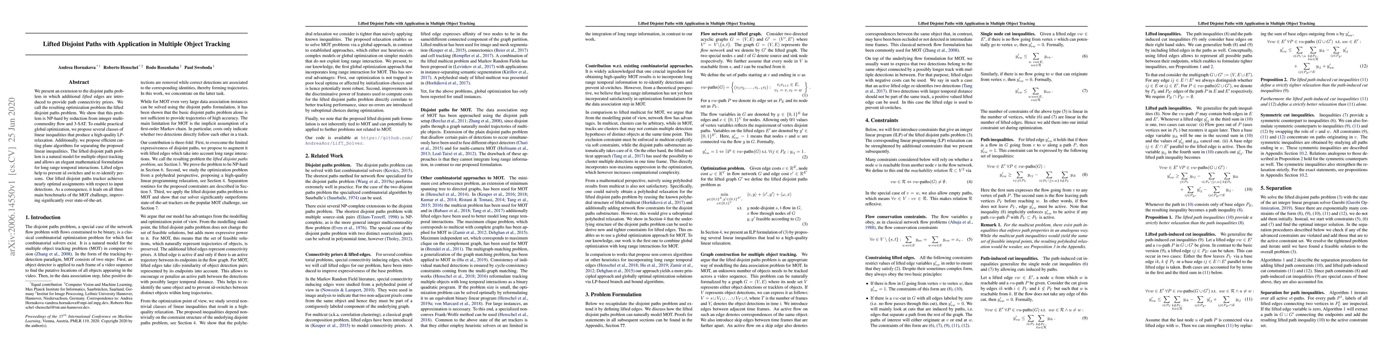 We present an extension to the disjoint paths problem in which additional \emph{lifted} edges are introduced to provide path connectivity priors. We call the resulting optimization problem the lifted disjoint paths problem. We show that this problem is NP-hard by reduction from integer multicommodity flow and 3-SAT. To enable practical global optimization, we propose several classes of linear inequalities that produce a high-quality LP-relaxation. Additionally, we propose efficient cutting plane algorithms for separating the proposed linear inequalities. The lifted disjoint path problem is a natural model for multiple object tracking and allows an elegant mathematical formulation for long range temporal interactions. Lifted edges help to prevent id switches and to re-identify persons. Our lifted disjoint paths tracker achieves nearly optimal assignments with respect to input detections. As a consequence, it leads on all three main benchmarks of the MOT challenge, improving significantly over state-of-the-art.