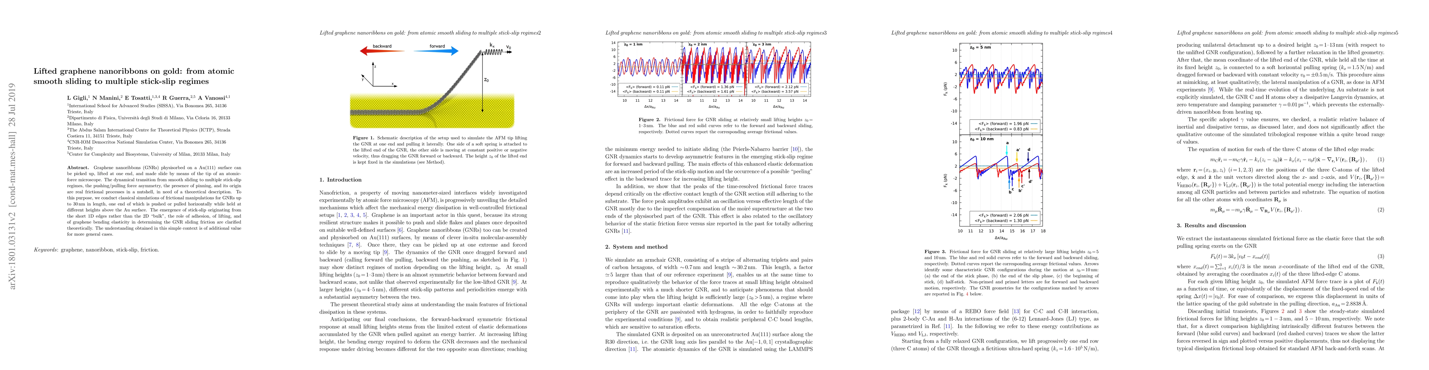 Graphene nanoribbons (GNRs) physisorbed on a Au(111) surface can be picked up, lifted at one end, and made slide by means of the tip of an atomic-force microscope. The dynamical transition from smooth sliding to multiple stick-slip regimes, the pushing/pulling force asymmetry, the presence of pinning, and its origin are real frictional processes in a nutshell, in need of a theoretical description. To this purpose, we conduct classical simulations of frictional manipulations for GNRs up to 30 nm in length, one end of which is pushed or pulled horizontally while held at different heights above the Au surface. These simulations allow us to clarify theoretically the emergence of stick-slip originating from the short 1D edges rather than the 2D "bulk", the role of adhesion, of lifting, and of graphene bending elasticity in determining the GNR sliding friction. The understanding obtained in this simple context is of additional value for more general cases.