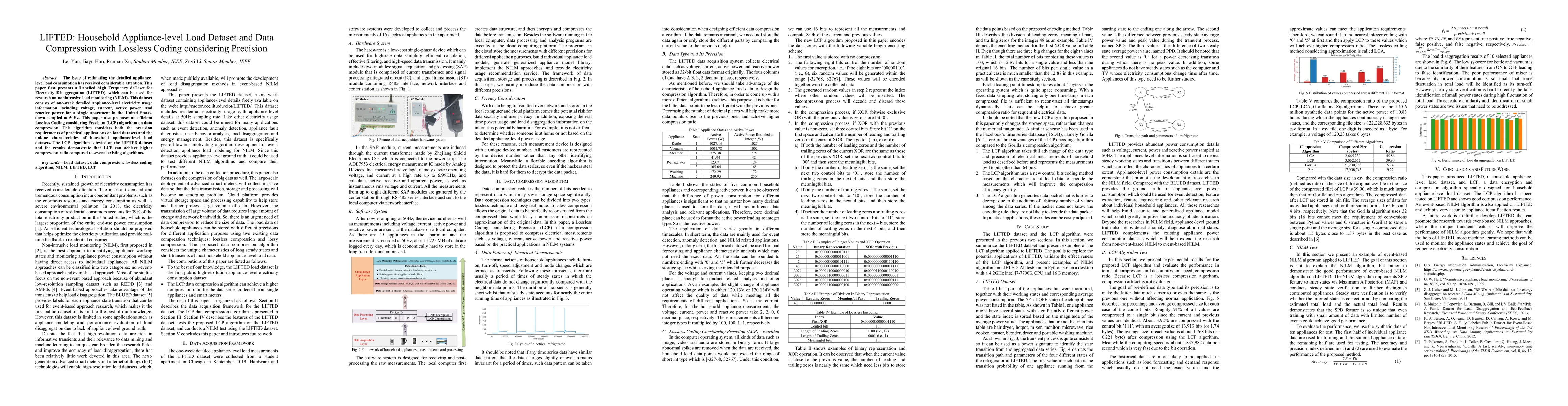 The issue of estimating the detailed appliance level load consumption has received considerable attention. This paper first presents a Labelled hIgh-Frequency daTaset for Electricity Disaggregation (LIFTED), which can be used for research on nonintrusive load monitoring (NILM). This dataset consists of one-week detailed appliance-level electricity usage information including voltage, current, active power, and reactive power for a single apartment in the United States, down-sampled at 50Hz. This paper also proposes an efficient Lossless Coding considering Precision (LCP) algorithm on data compression. This algorithm considers both the precision requirements of practical applications on load datasets and the unique characteristics of household appliance-level load datasets. The LCP algorithm is tested on the LIFTED dataset and the results demonstrate that LCP can achieve a higher compression ratio compared to several existing algorithms.