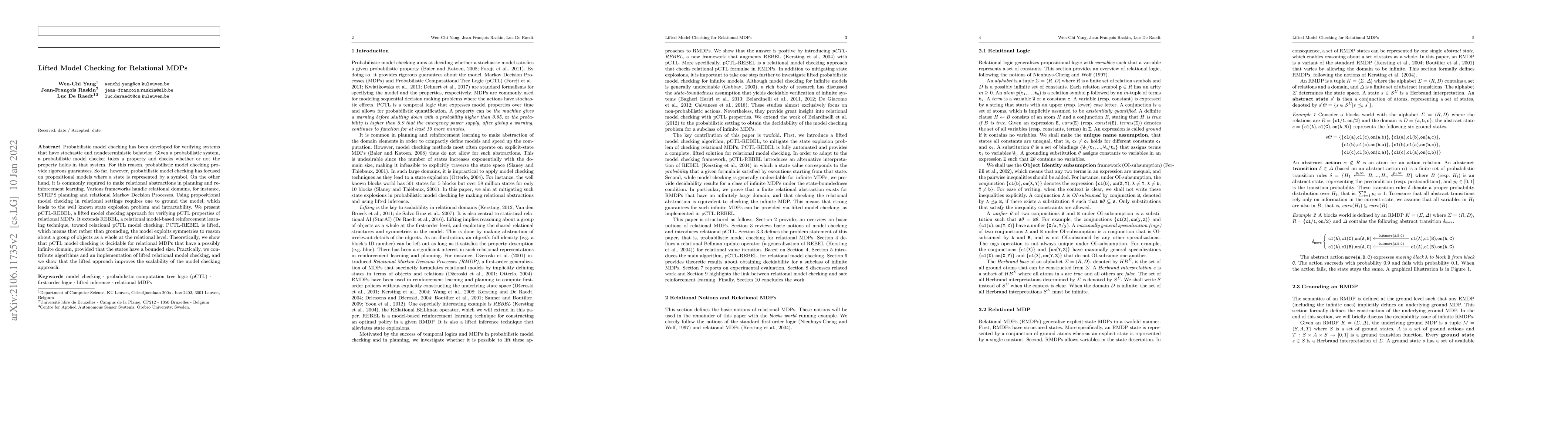 This paper introduces pCTL-REBEL, a lifted model checking technique for verifying properties in relational Markov Decision Processes (MDPs) without the state explosion problem. The method exploits symmetries to reason at a higher level, improving scalability and decidability for infinite-domain relational MDPs with bounded state sizes.