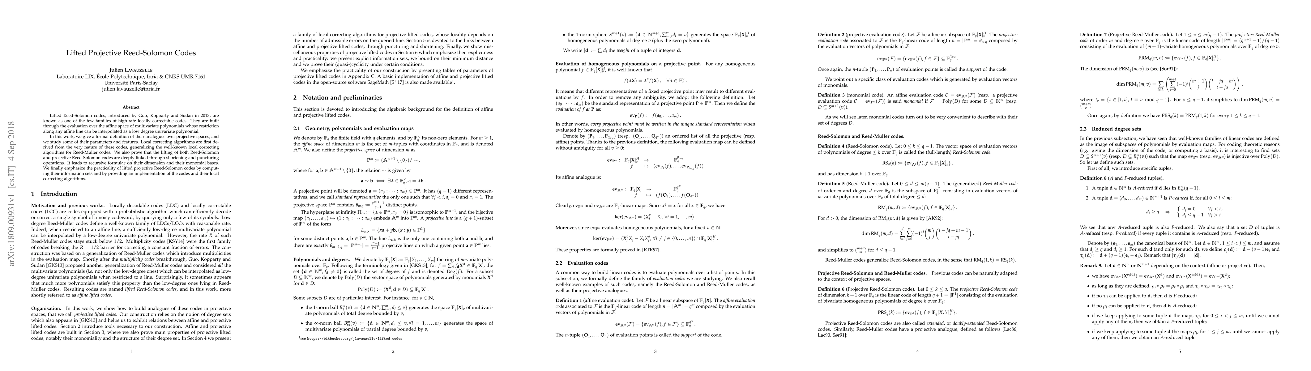 This paper formally defines lifted projective Reed-Solomon codes and explores their properties, deriving local correcting algorithms and proving a connection between Reed-Solomon and projective Reed-Solomon codes through operations like shortening and puncturing. Practical implementation and computation of information sets are also provided.