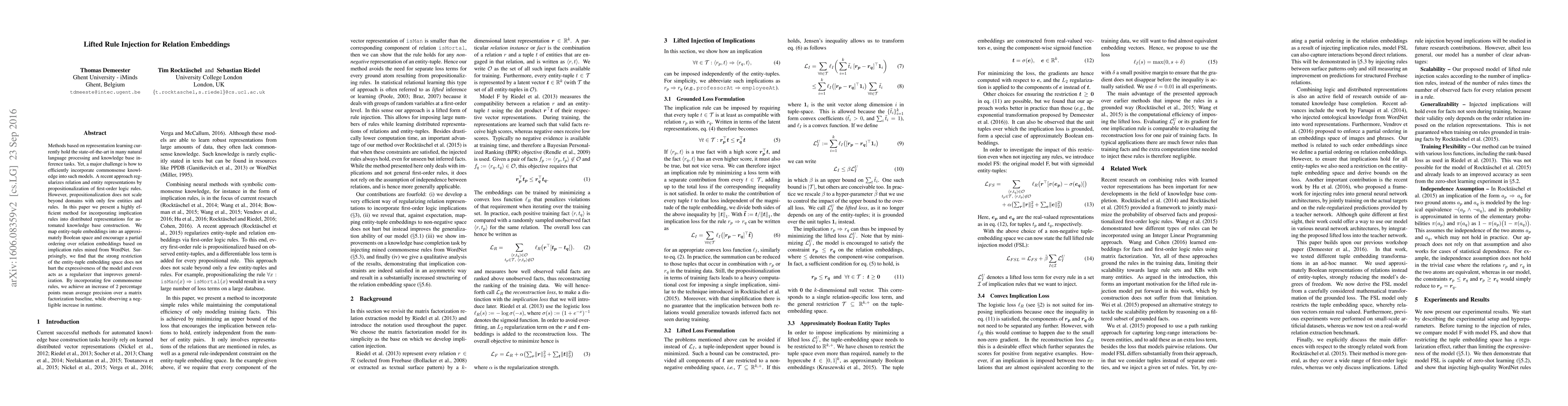 Methods based on representation learning currently hold the state-of-the-art in many natural language processing and knowledge base inference tasks. Yet, a major challenge is how to efficiently incorporate commonsense knowledge into such models. A recent approach regularizes relation and entity representations by propositionalization of first-order logic rules. However, propositionalization does not scale beyond domains with only few entities and rules. In this paper we present a highly efficient method for incorporating implication rules into distributed representations for automated knowledge base construction. We map entity-tuple embeddings into an approximately Boolean space and encourage a partial ordering over relation embeddings based on implication rules mined from WordNet. Surprisingly, we find that the strong restriction of the entity-tuple embedding space does not hurt the expressiveness of the model and even acts as a regularizer that improves generalization. By incorporating few commonsense rules, we achieve an increase of 2 percentage points mean average precision over a matrix factorization baseline, while observing a negligible increase in runtime.