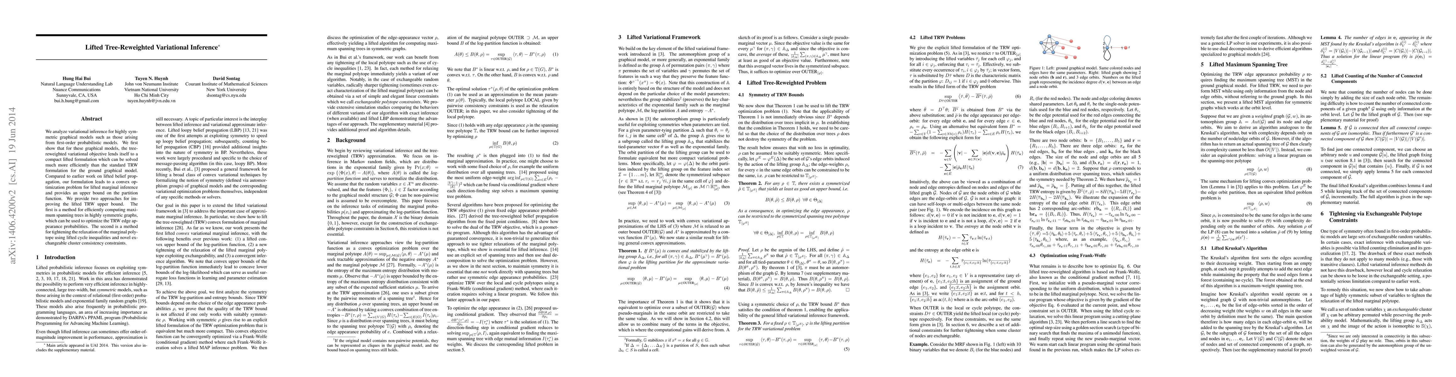 We analyze variational inference for highly symmetric graphical models such as those arising from first-order probabilistic models. We first show that for these graphical models, the tree-reweighted variational objective lends itself to a compact lifted formulation which can be solved much more efficiently than the standard TRW formulation for the ground graphical model. Compared to earlier work on lifted belief propagation, our formulation leads to a convex optimization problem for lifted marginal inference and provides an upper bound on the partition function. We provide two approaches for improving the lifted TRW upper bound. The first is a method for efficiently computing maximum spanning trees in highly symmetric graphs, which can be used to optimize the TRW edge appearance probabilities. The second is a method for tightening the relaxation of the marginal polytope using lifted cycle inequalities and novel exchangeable cluster consistency constraints.