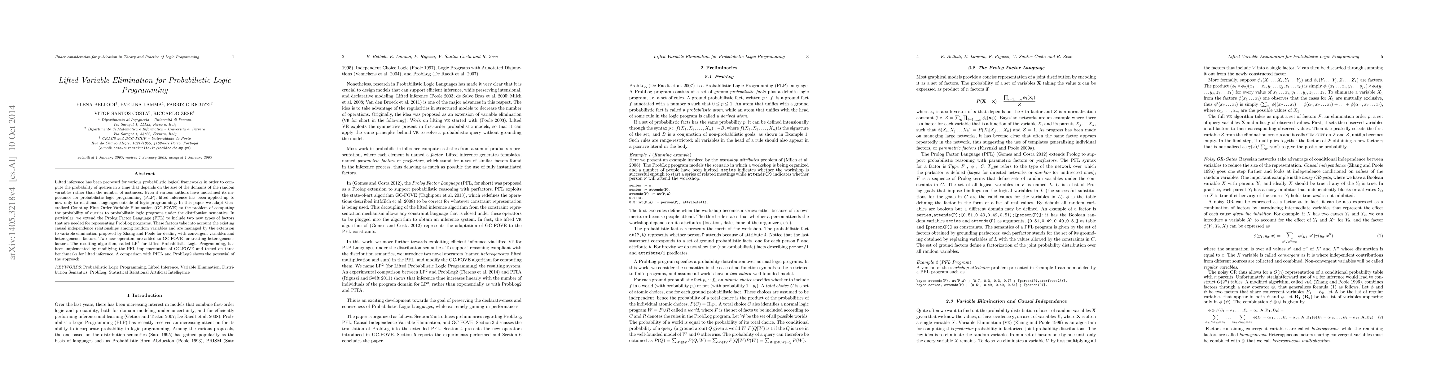 This paper introduces LP$^2$, an algorithm for lifted probabilistic logic programming by adapting Generalized Counting First Order Variable Elimination (GC-FOVE) to compute query probabilities efficiently. It extends the Prolog Factor Language to handle causal independence and introduces new operators for heterogeneous factors, demonstrating its effectiveness through benchmark comparisons.