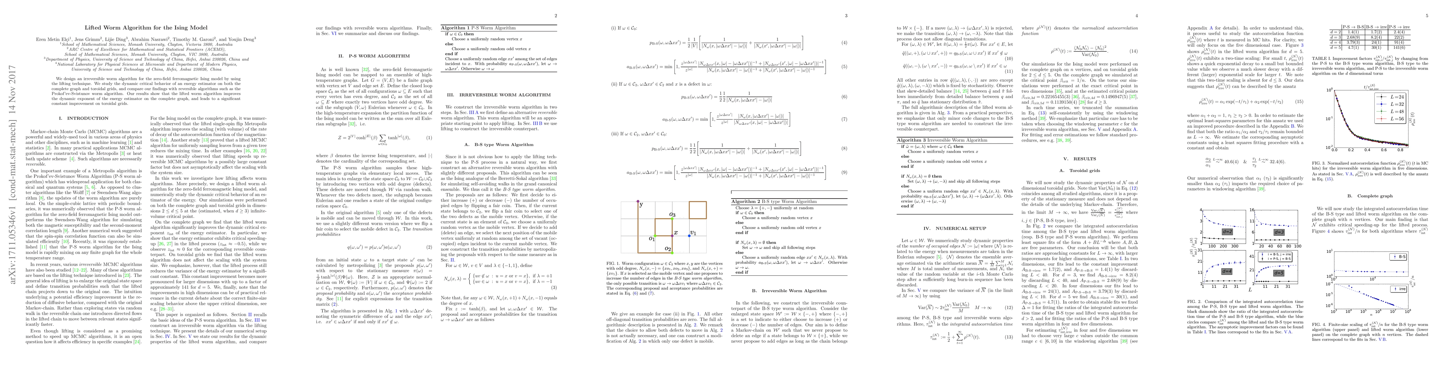 The lifted worm algorithm enhances the dynamic exponent of an energy estimator for the zero-field ferromagnetic Ising model on complete graphs and shows significant constant improvement on toroidal grids compared to reversible algorithms like the Prokof'ev-Svistunov worm algorithm.