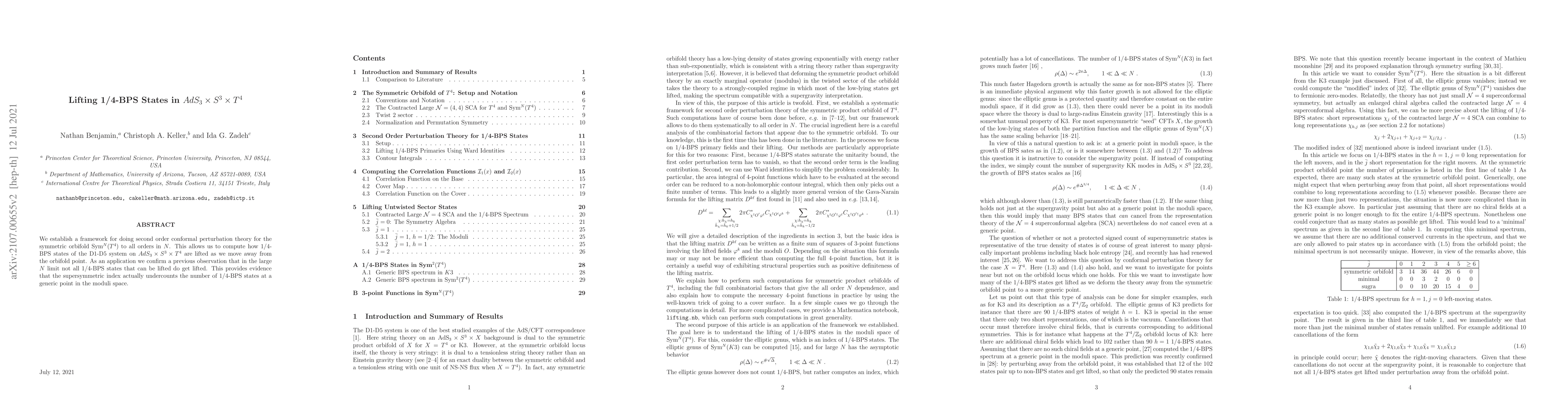We establish a framework for doing second order conformal perturbation theory for the symmetric orbifold Sym$^N(T^4)$ to all orders in $N$. This allows us to compute how 1/4-BPS states of the D1-D5 system on $AdS_3\times S^3\times T^4$ are lifted as we move away from the orbifold point. As an application we confirm a previous observation that in the large $N$ limit not all 1/4-BPS states that can be lifted do get lifted. This provides evidence that the supersymmetric index actually undercounts the number of 1/4-BPS states at a generic point in the moduli space.
