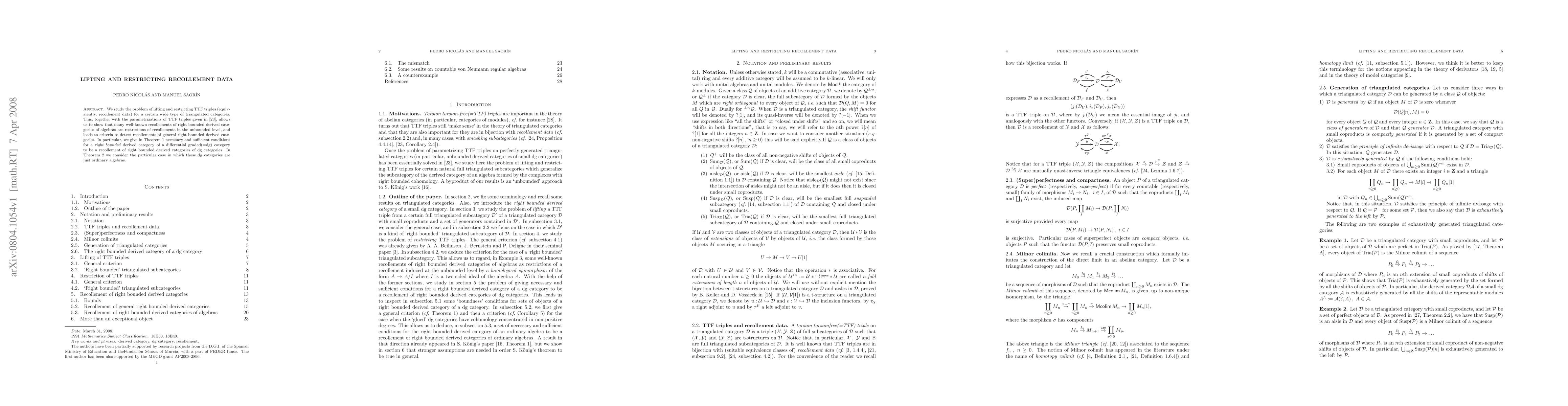 We study the problem of lifting and restricting TTF triples (equivalently, recollement data) for a certain wide type of triangulated categories. This, together with the parametrizations of TTF triples given in "Parametrizing recollement data", allows us to show that many well-known recollements of right bounded derived categories of algebras are restrictions of recollements in the unbounded level, and leads to criteria to detect recollements of general right bounded derived categories. In particular, we give in Theorem 1 necessary and sufficient conditions for a 'right bounded' derived category of a differential graded(=dg) category to be a recollement of 'right bounded' derived categories of dg categories. In Theorem 2 we consider the particular case in which those dg categories are just ordinary algebras.