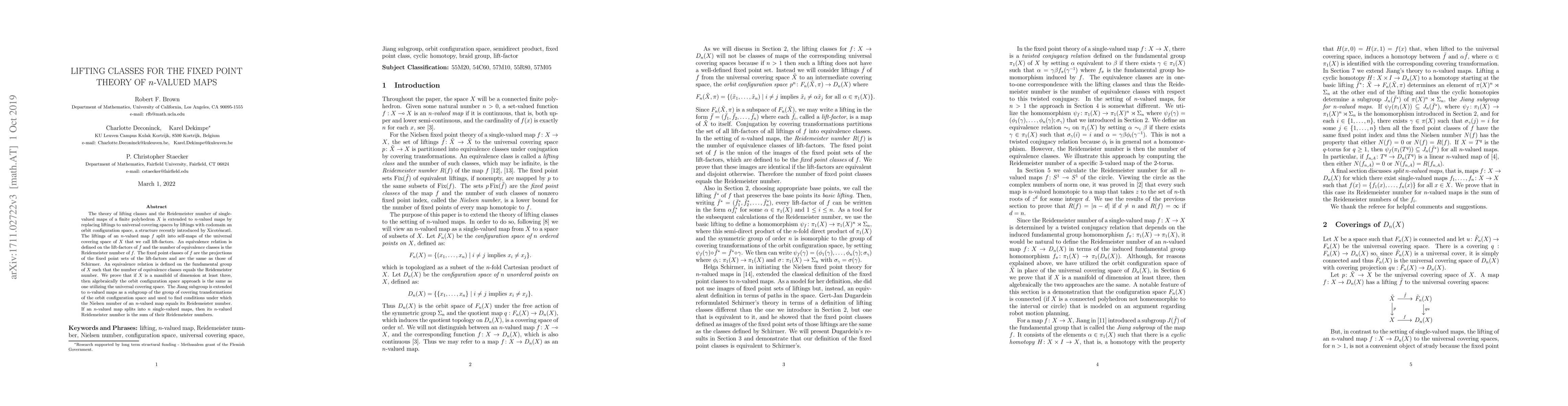 The theory of lifting classes and the Reidemeister number of single-valued maps of a finite polyhedron $X$ is extended to $n$-valued maps by replacing liftings to universal covering spaces by liftings with codomain an orbit configuration space, a structure recently introduced by Xicot\'encatl. The liftings of an $n$-valued map $f$ split into self-maps of the universal covering space of $X$ that we call lift-factors. An equivalence relation is defined on the lift-factors of $f$ and the number of equivalence classes is the Reidemeister number of $f$. The fixed point classes of $f$ are the projections of the fixed point sets of the lift-factors and are the same as those of Schirmer. An equivalence relation is defined on the fundamental group of $X$ such that the number of equivalence classes equals the Reidemeister number. We prove that if $X$ is a manifold of dimension at least three, then algebraically the orbit configuration space approach is the same as one utilizing the universal covering space. The Jiang subgroup is extended to $n$-valued maps as a subgroup of the group of covering transformations of the orbit configuration space and used to find conditions under which the Nielsen number of an $n$-valued map equals its Reidemeister number. If an $n$-valued map splits into $n$ single-valued maps, then its $n$-valued Reidemeister number is the sum of their Reidemeister numbers.