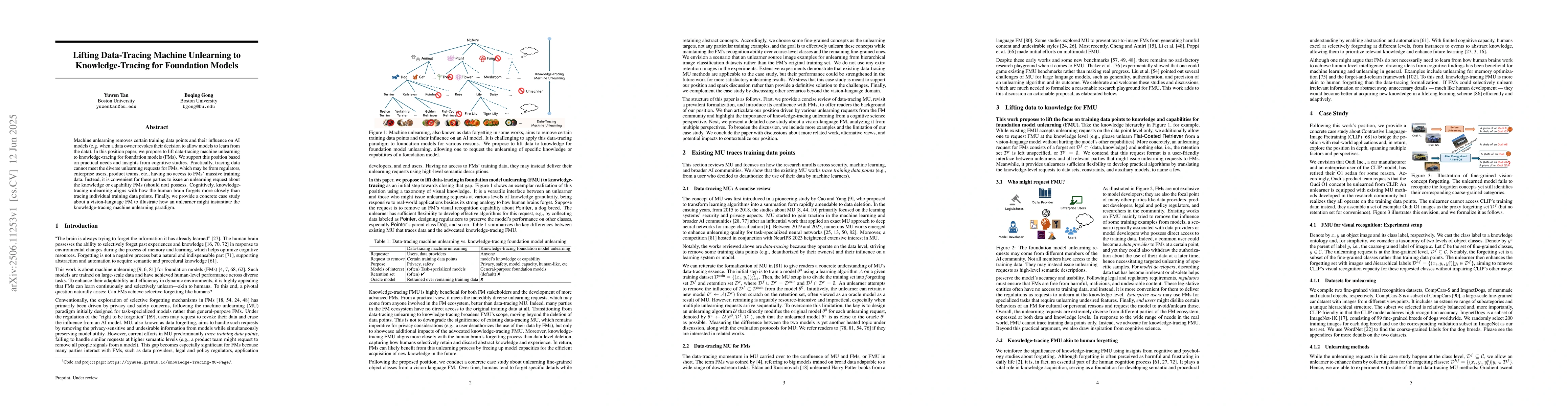Machine unlearning removes certain training data points and their influence on AI models (e.g., when a data owner revokes their decision to allow models to learn from the data). In this position paper, we propose to lift data-tracing machine unlearning to knowledge-tracing for foundation models (FMs). We support this position based on practical needs and insights from cognitive studies. Practically, tracing data cannot meet the diverse unlearning requests for FMs, which may be from regulators, enterprise users, product teams, etc., having no access to FMs' massive training data. Instead, it is convenient for these parties to issue an unlearning request about the knowledge or capability FMs (should not) possess. Cognitively, knowledge-tracing unlearning aligns with how the human brain forgets more closely than tracing individual training data points. Finally, we provide a concrete case study about a vision-language FM to illustrate how an unlearner might instantiate the knowledge-tracing machine unlearning paradigm.